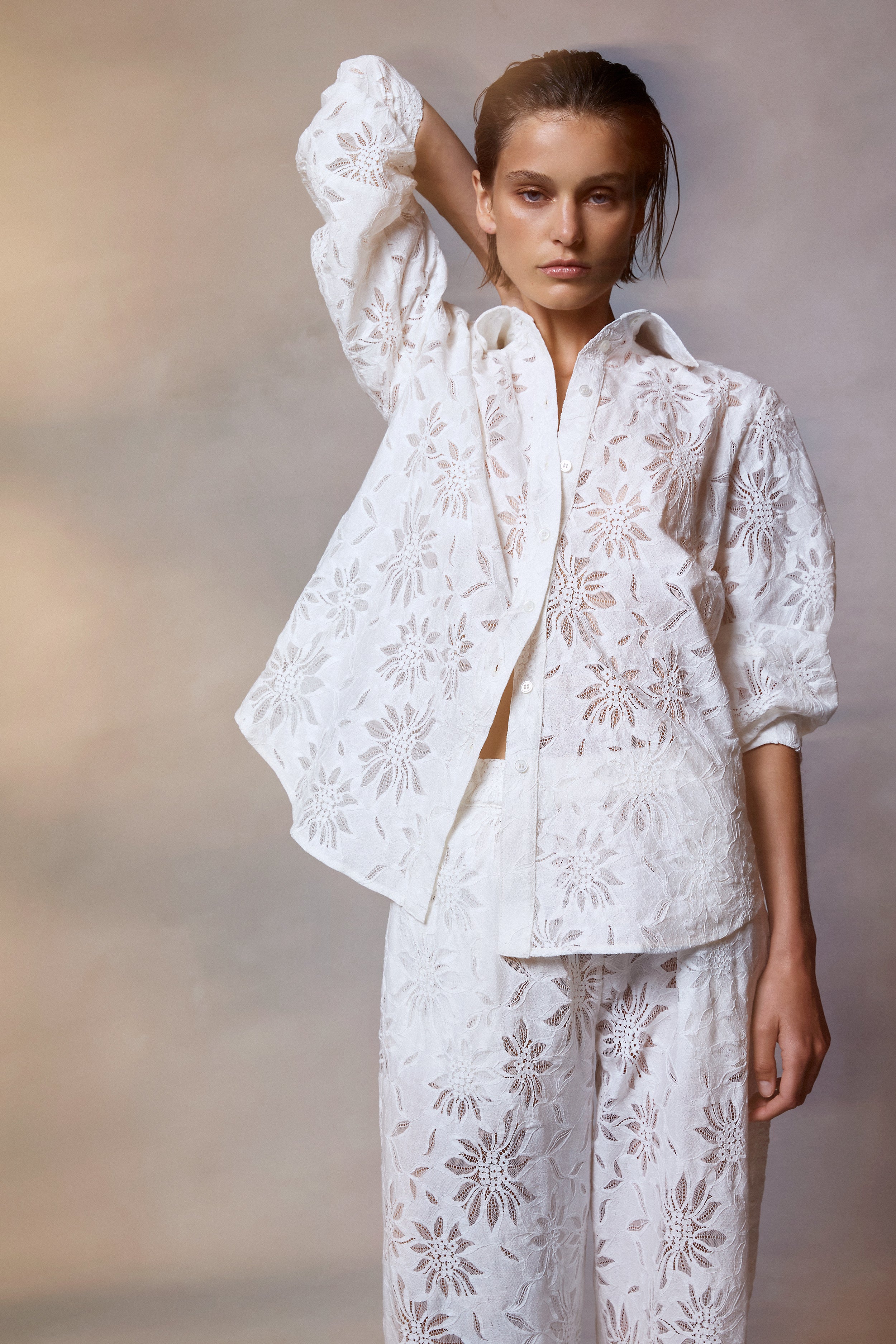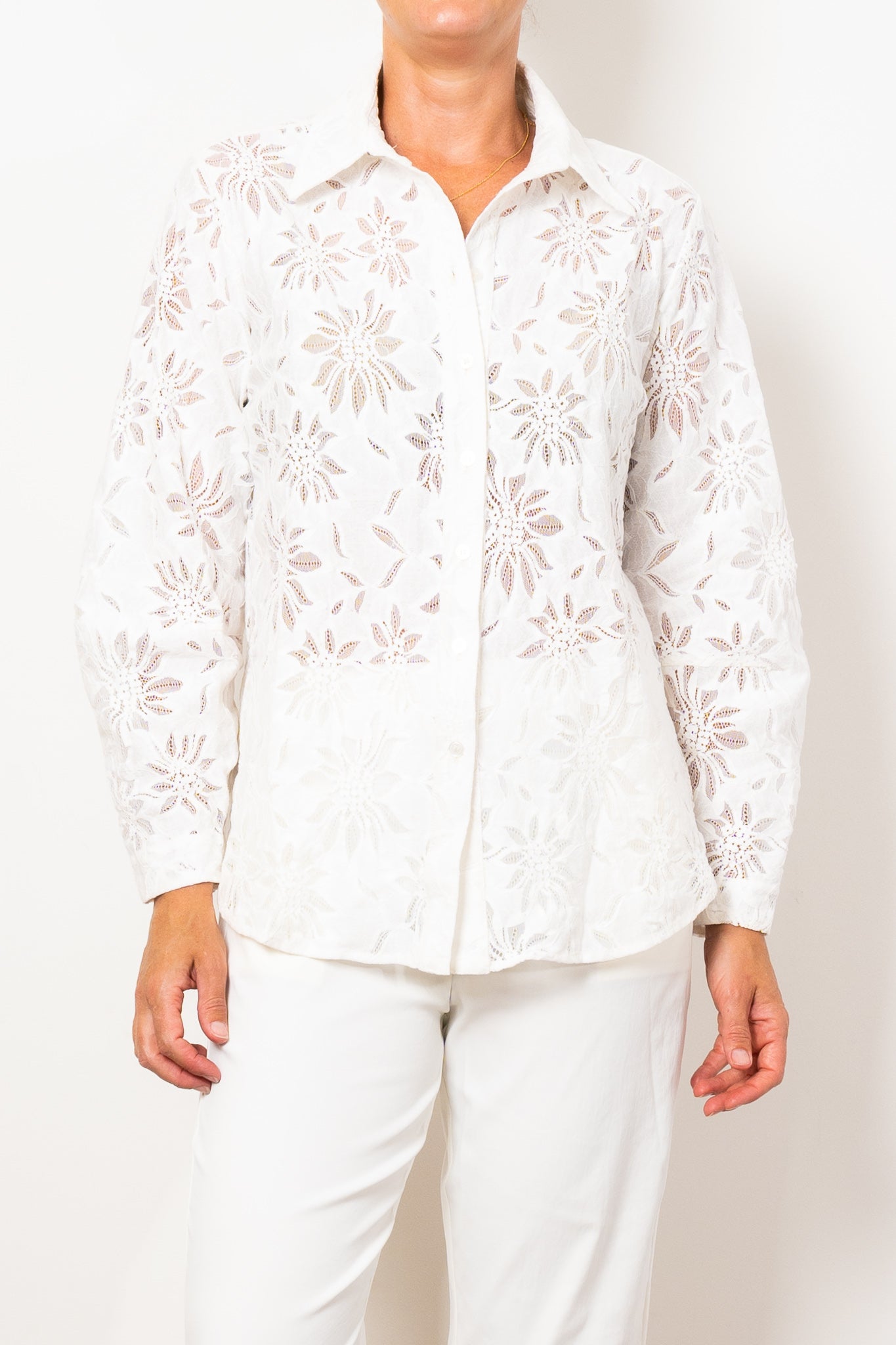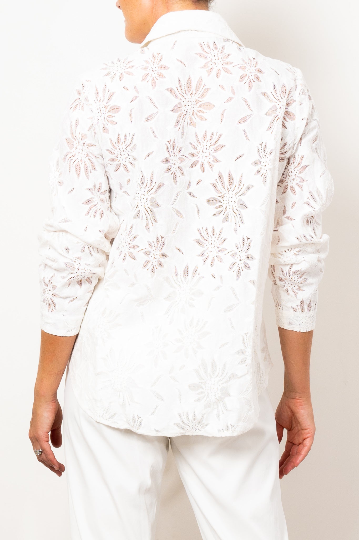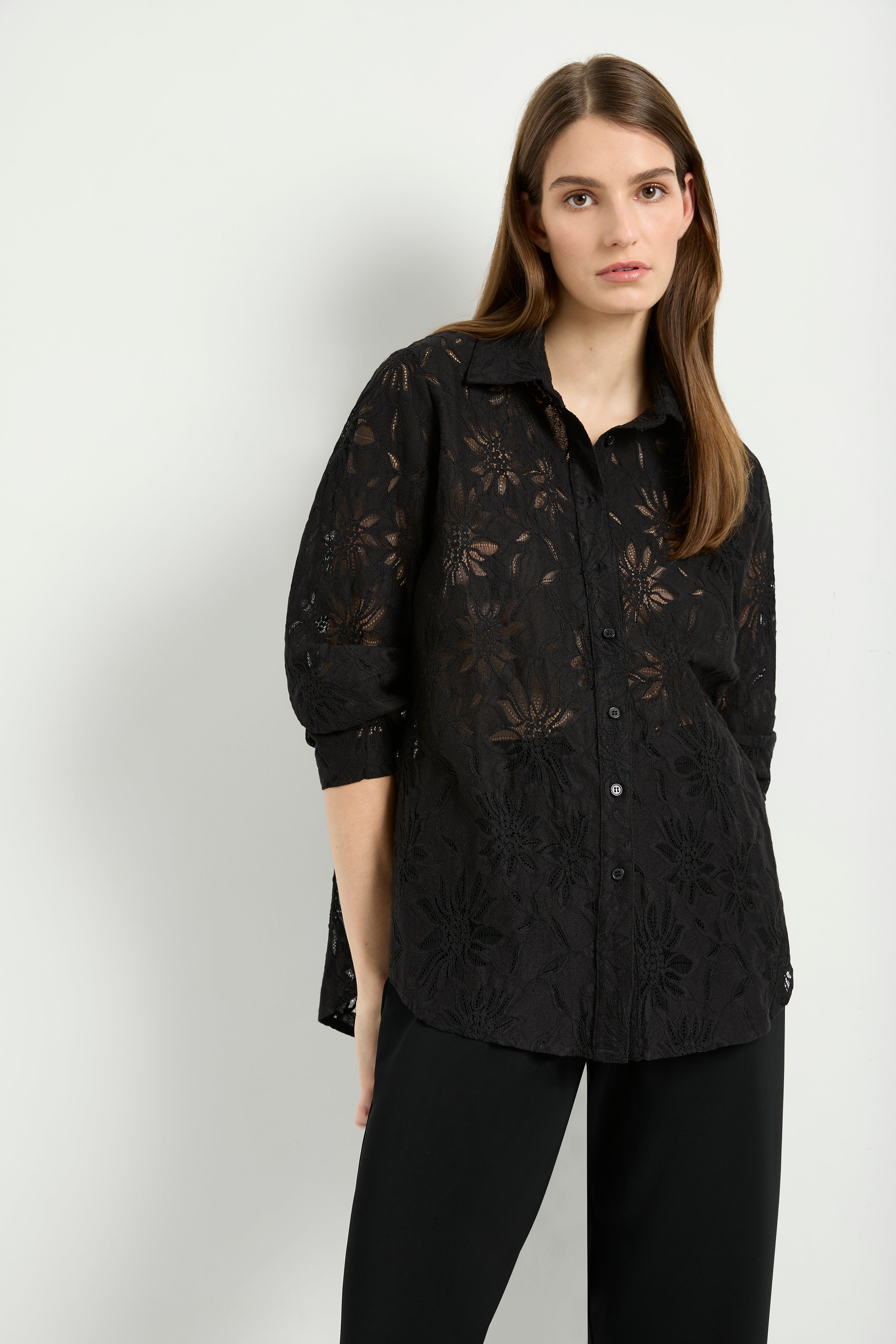 Experience the beauty and elegance of Mela Purdie's Flora Lace with the Dart Shirt. Crafted with detailed large Lace florals, this non-stretch knit shirt features a strong collar and stand, full button closure, and a curved hemline. Made in Australia, it's a modern twist on a timeless classic.