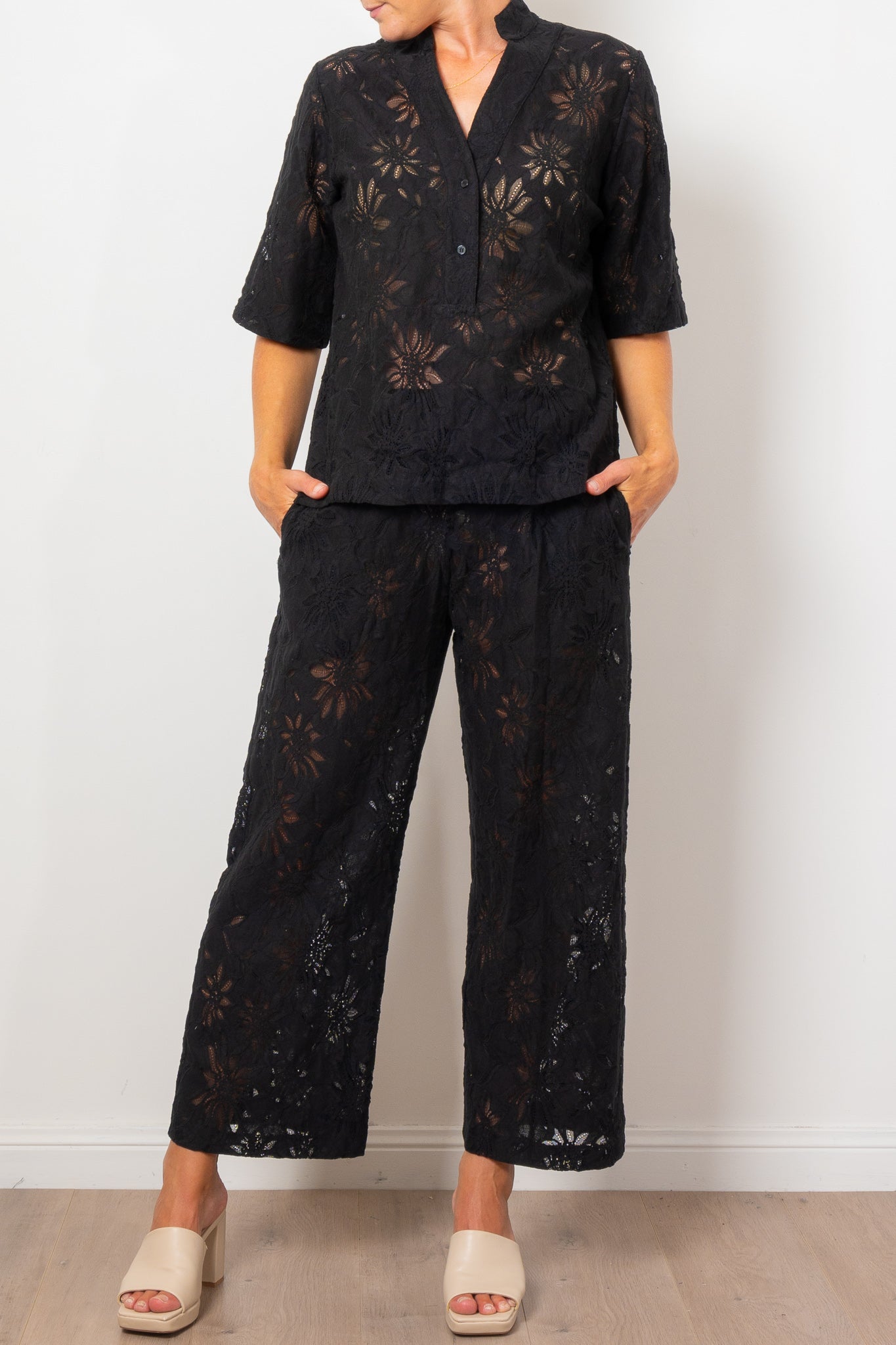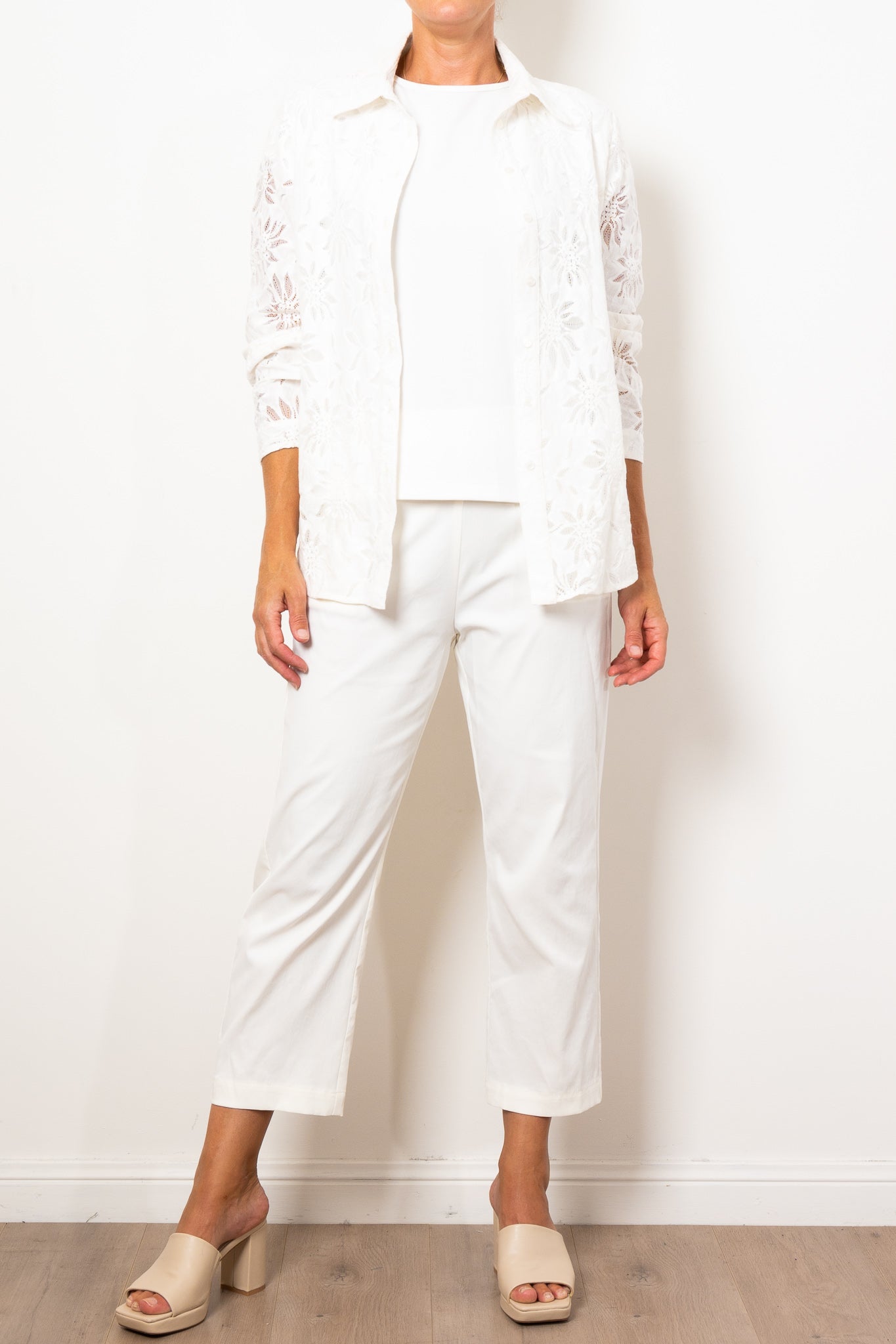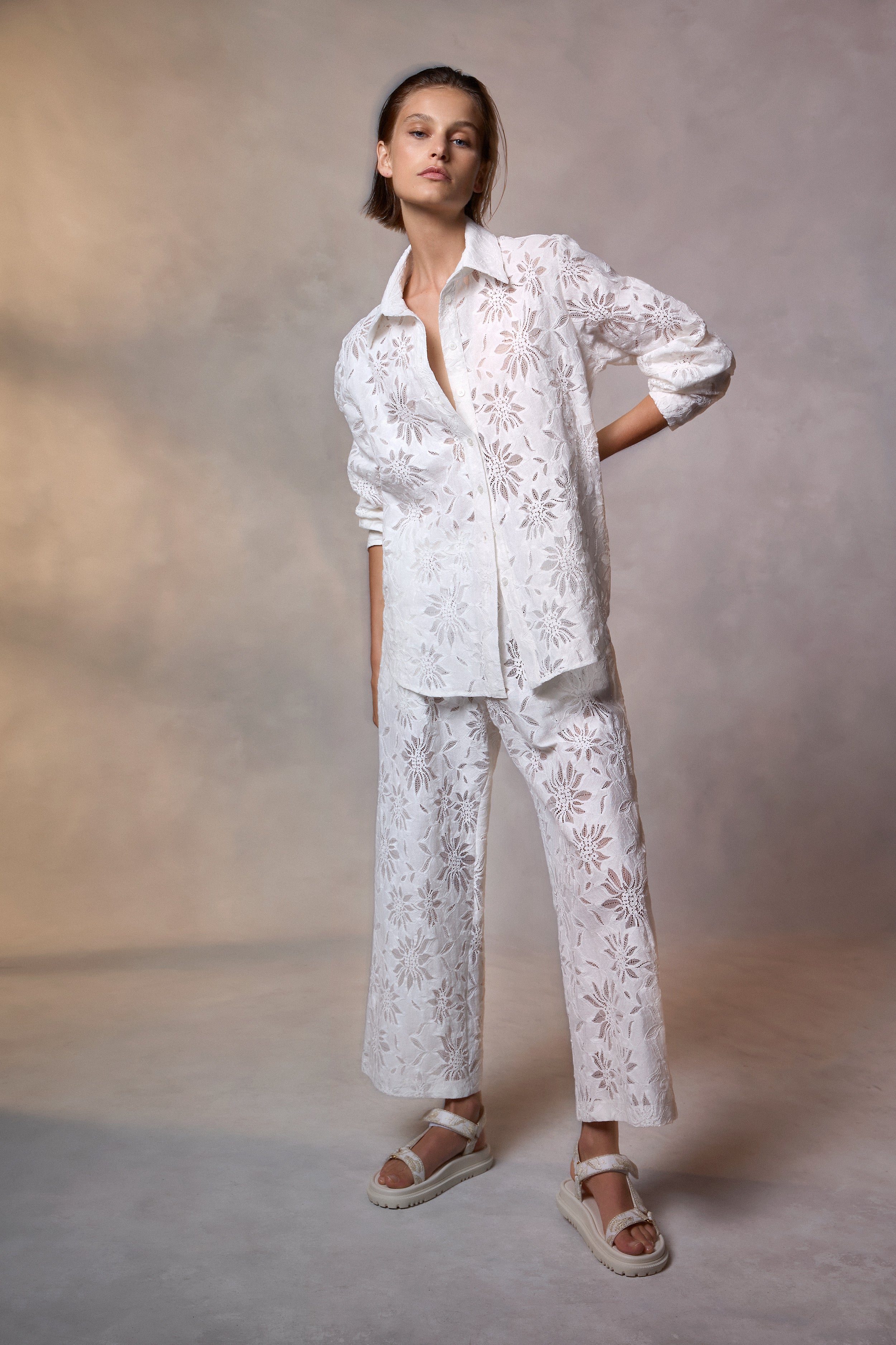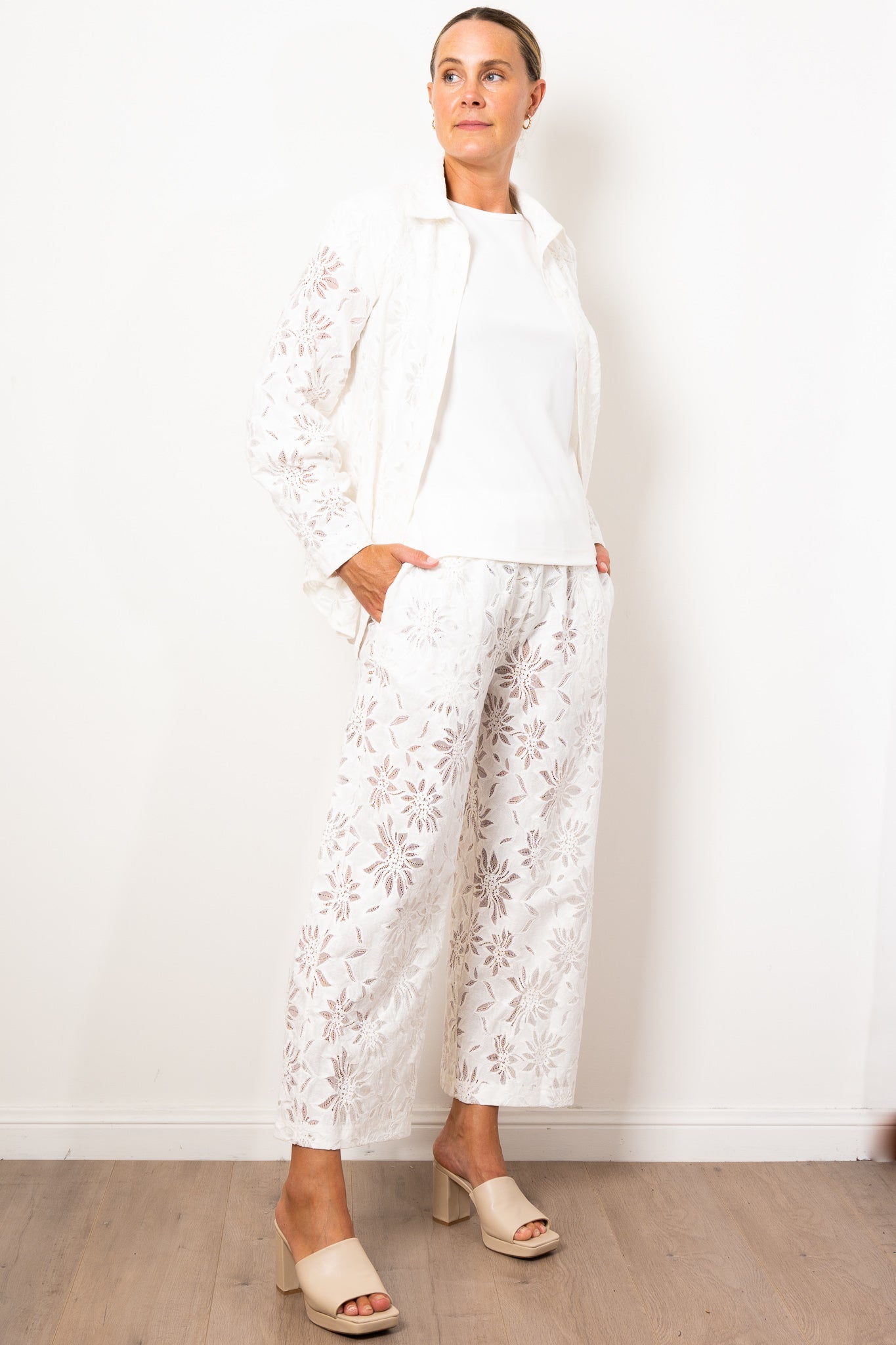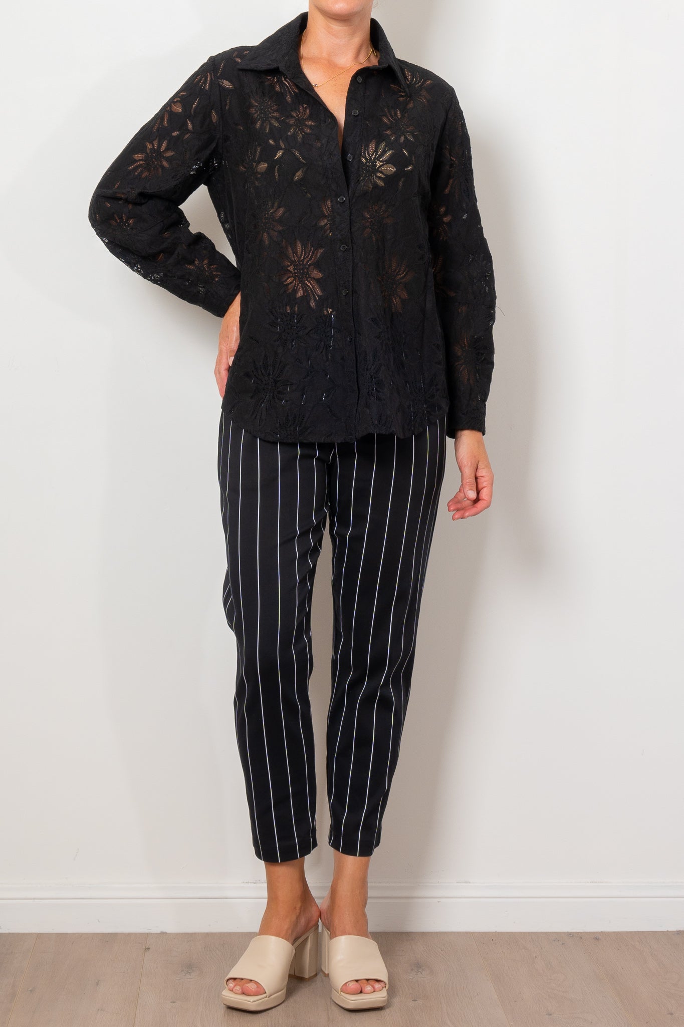 Experience the beauty and elegance of Mela Purdie's Flora Lace with the Dart Shirt. Crafted with detailed large Lace florals, this non-stretch knit shirt features a strong collar and stand, full button closure, and a curved hemline. Made in Australia, it's a modern twist on a timeless classic.