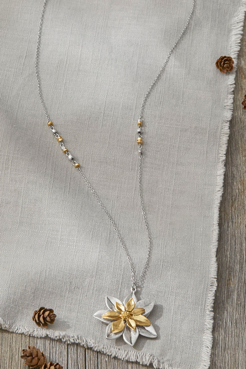 The star flower of the season, beautifully detailed in two-tone metal with glass accent beads on the chain.