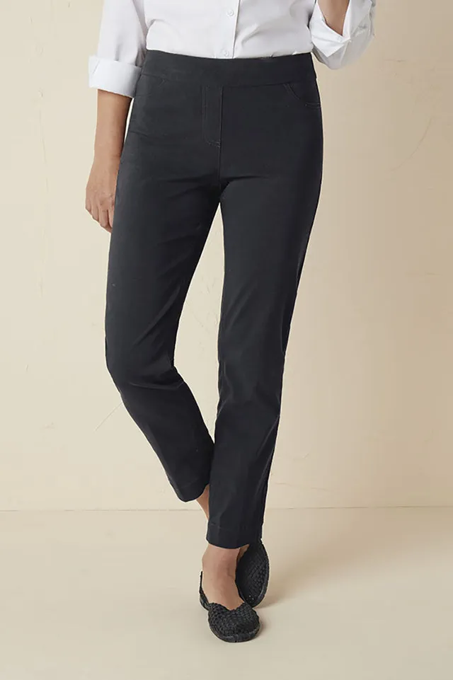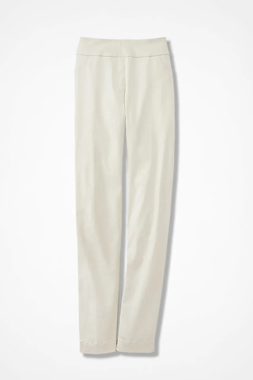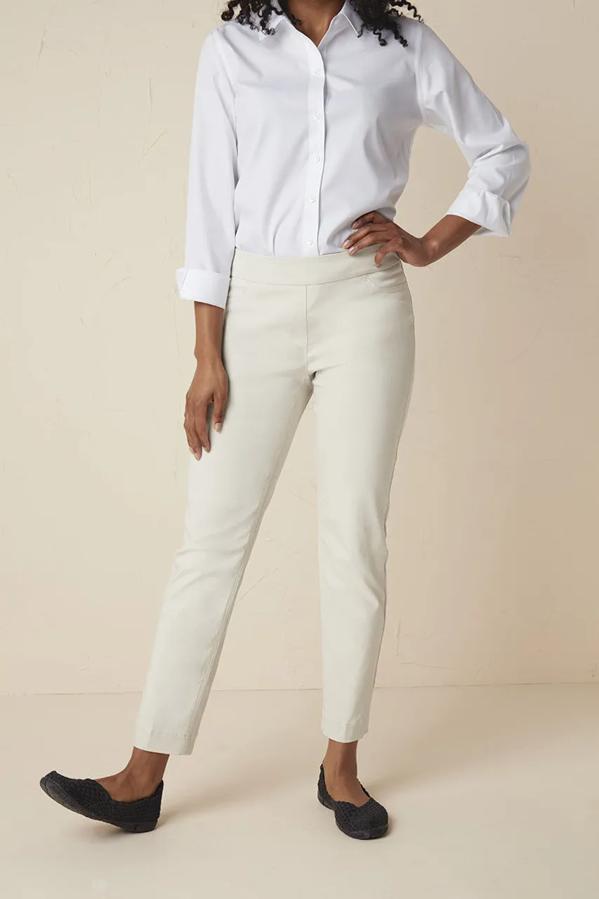 Sleek pull-on pants have a hidden, flexible tummy control panel to trim you comfortably. Slim lines fit close to the body while stretch fabric moves with you, resists wrinkles and retains its shape wear after wear. Faux front pockets and fly, back patch pockets. Imported