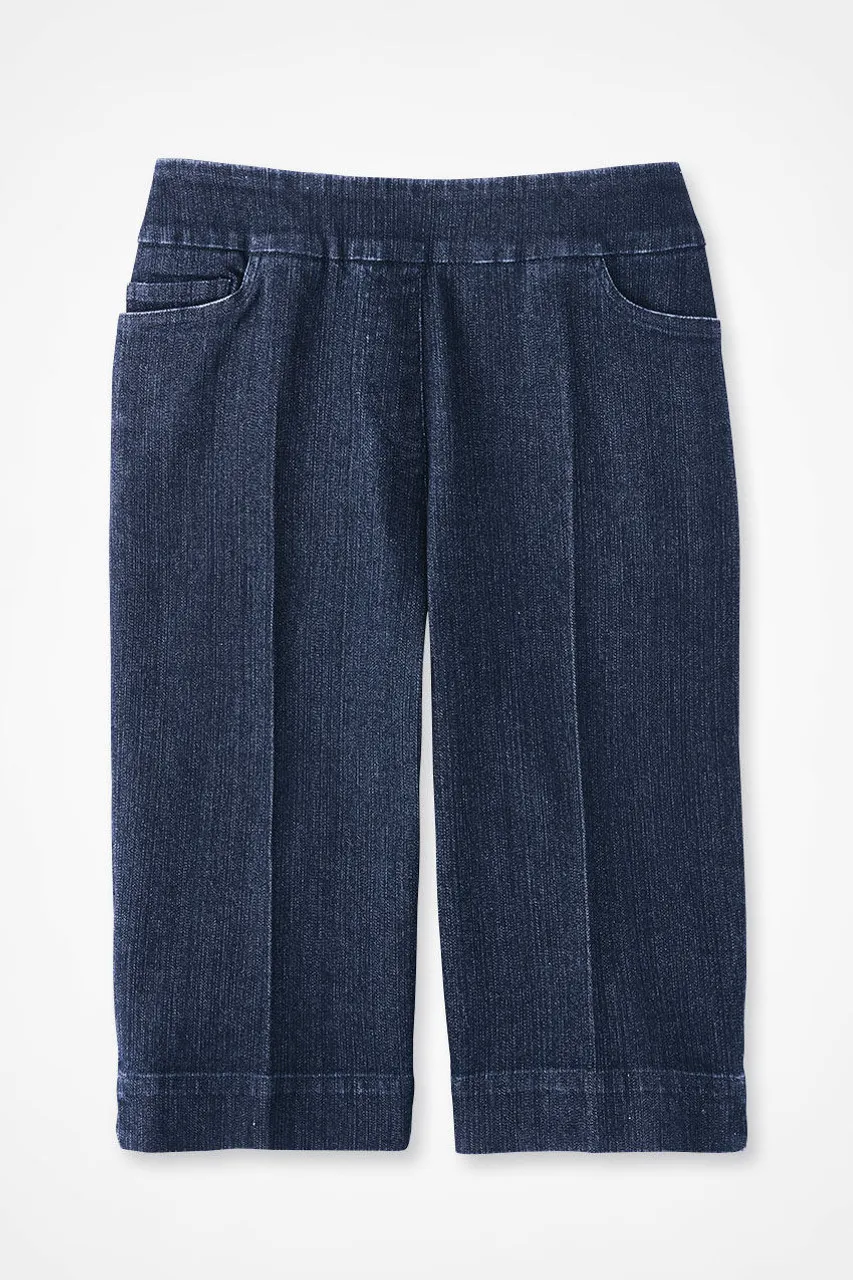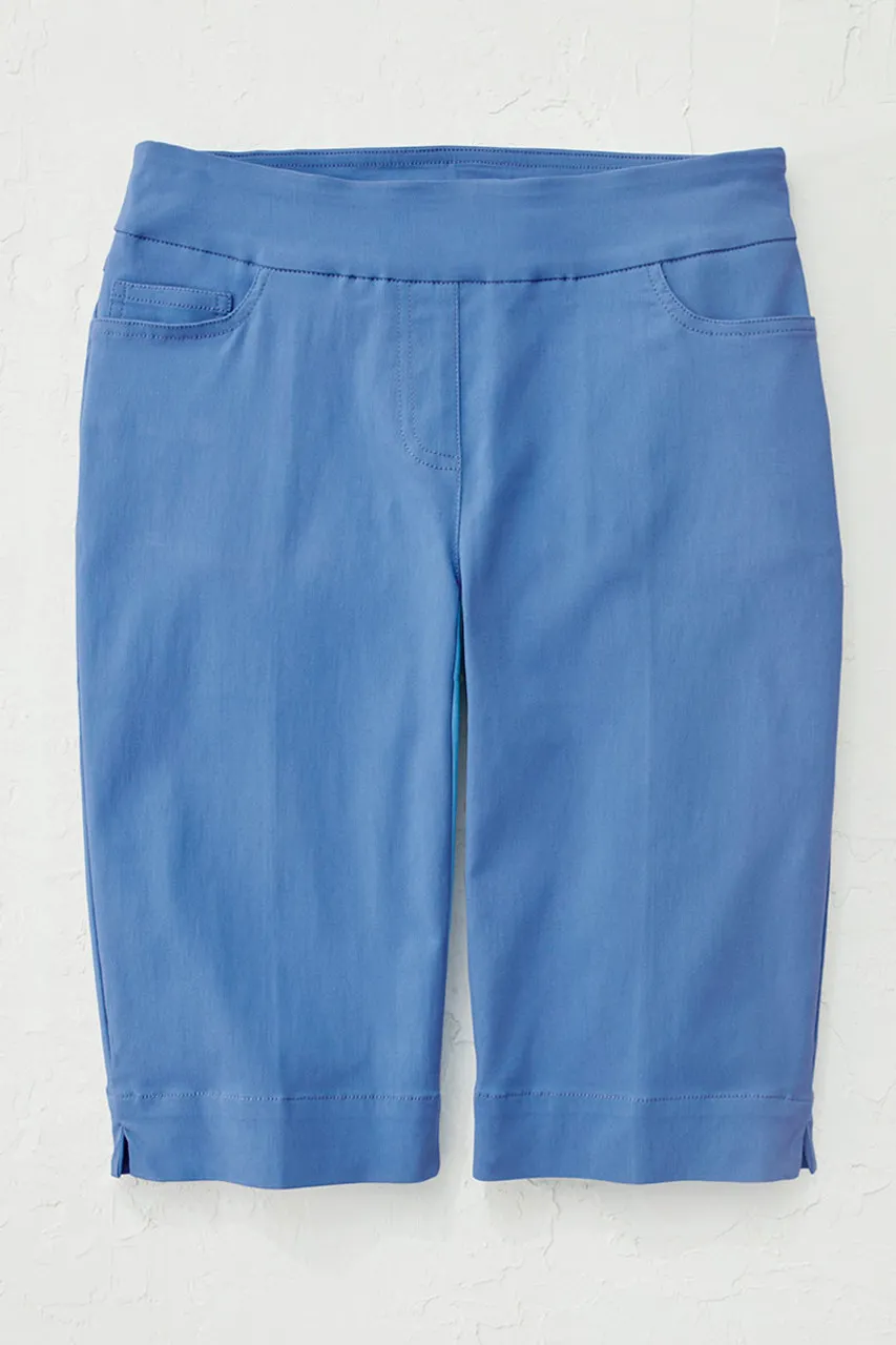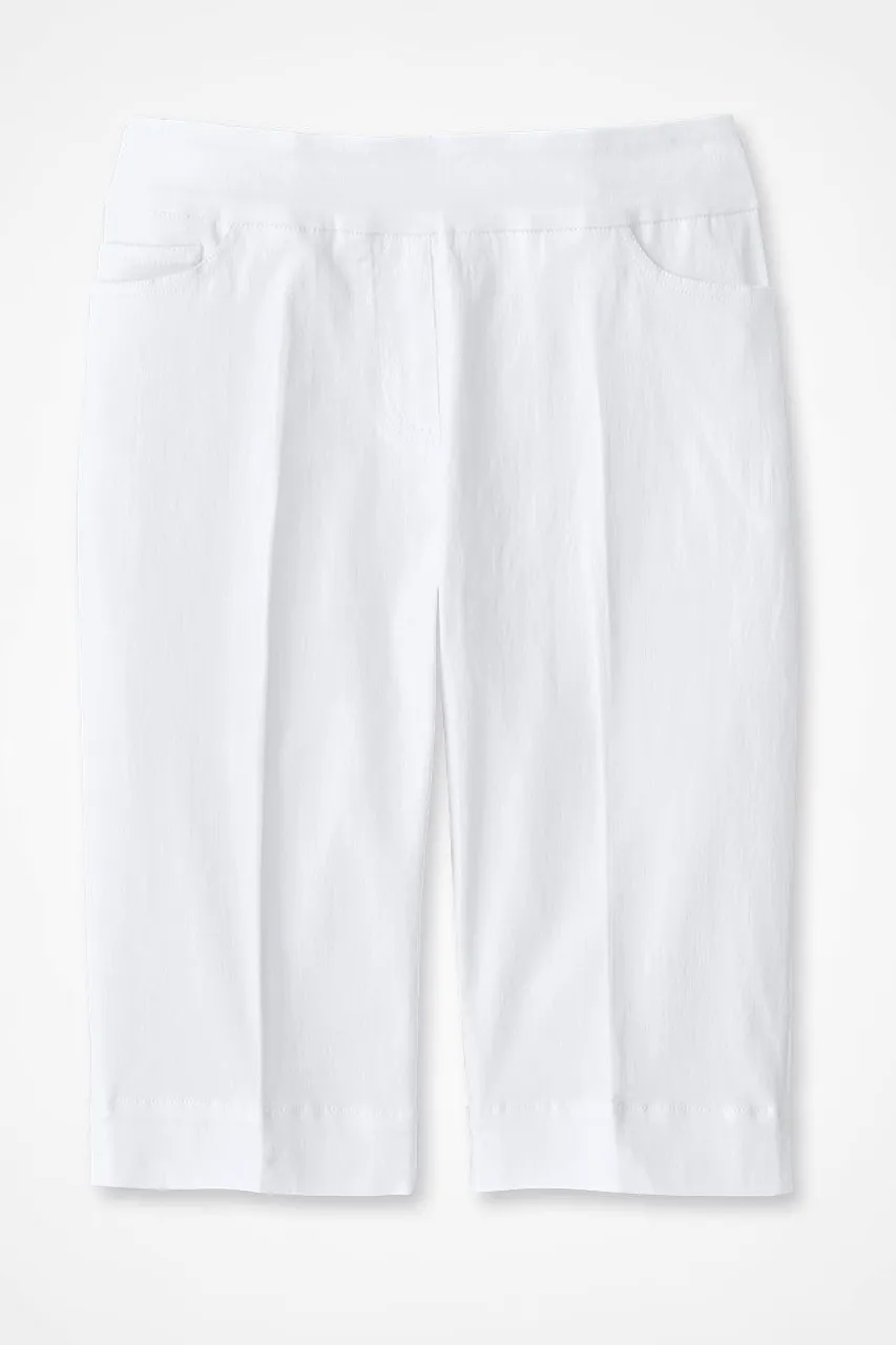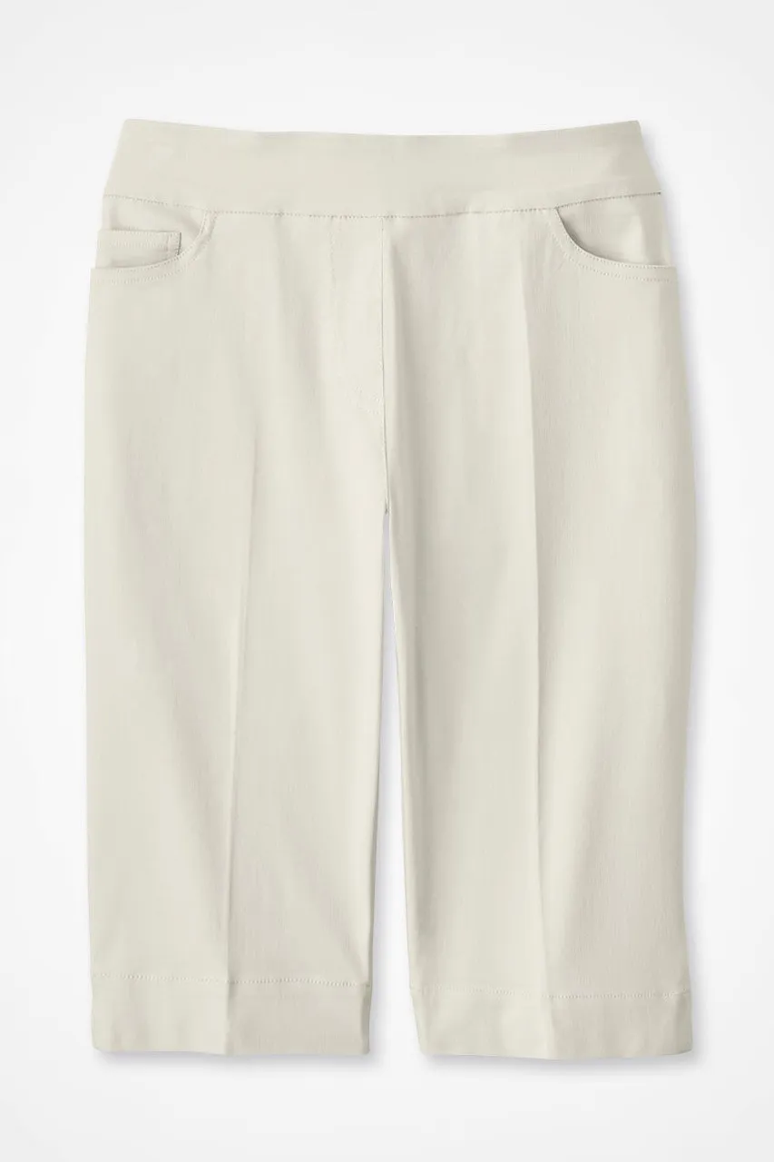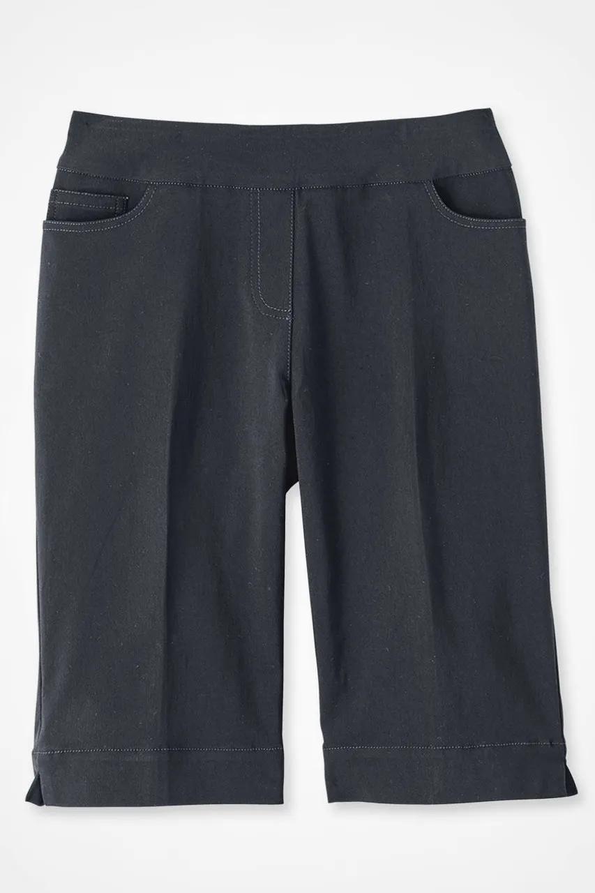 These sleek, polished shorts in woven stretch twill offer pull-on ease, plus a hidden flexible tummy control panel to smooth and shape. Five-pocket styling, hits at knee. Imported.