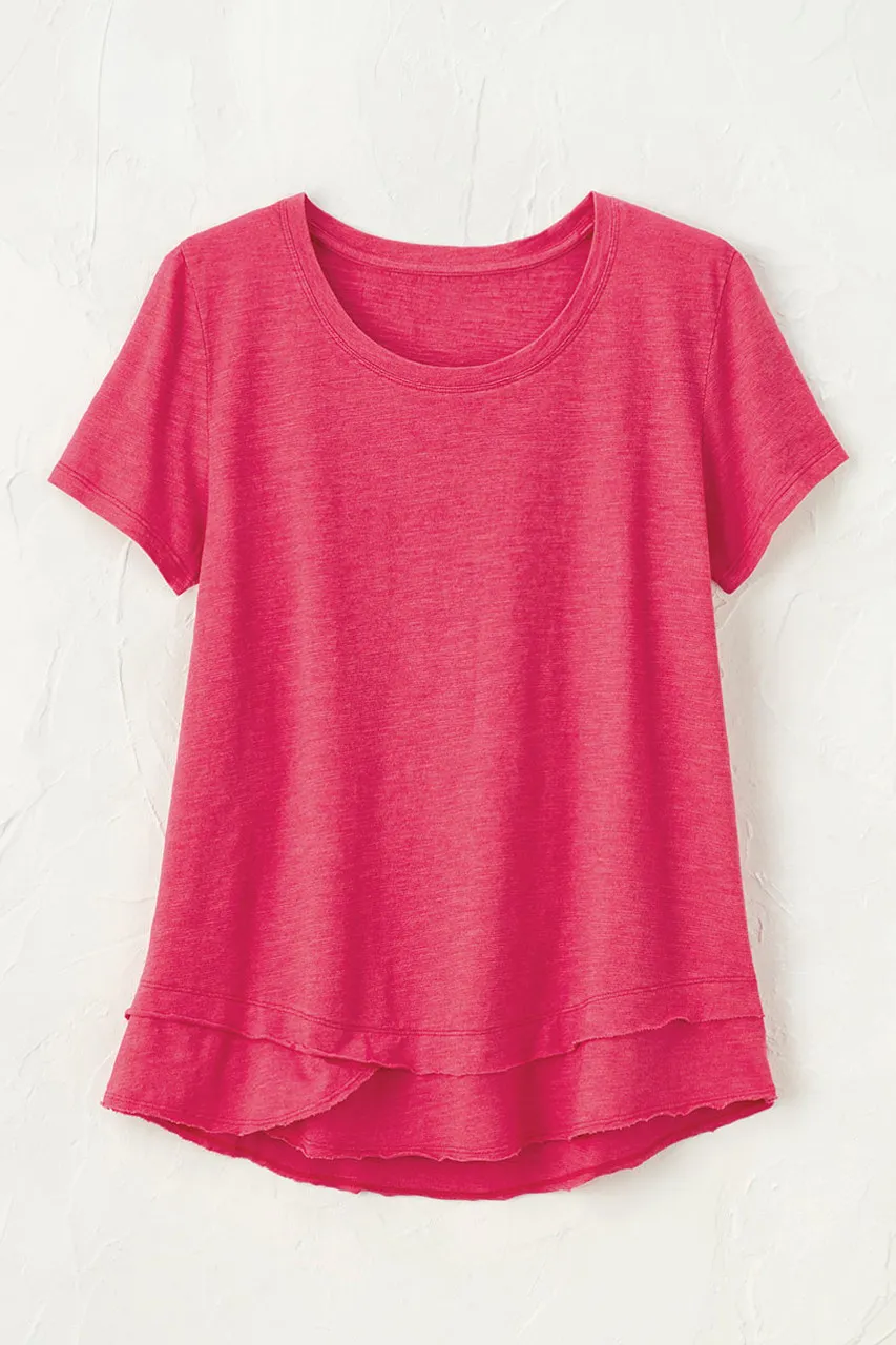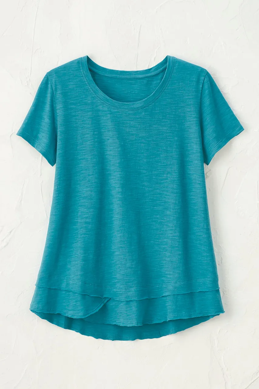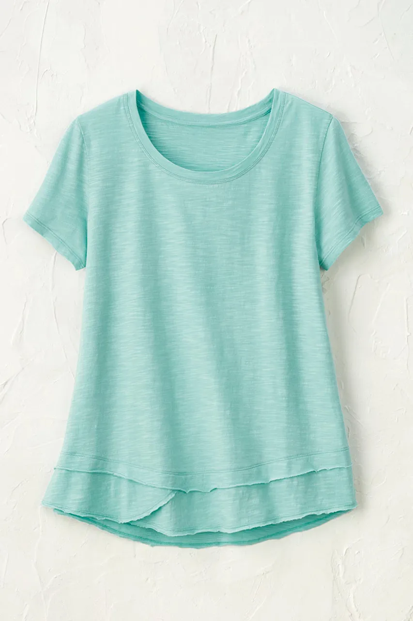 Three cheers for the weekend – or any day. This light, slub knit tee adds a special touch with a raw-edge pieced hem and a slight high-low hem. Slight A-line silhouette.