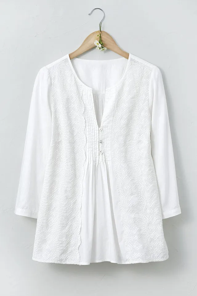 Delicate details make this slipover blouse feel special anytime. Eyelet-inspired tonal embroidery on front, with a 3-button split neck, pintucks and shirred back yoke.