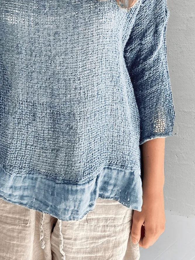 Women Blue Loose Crew Neck Lightweight breathable Three Quarter Sleeve Cotton And Linen Tunic Top