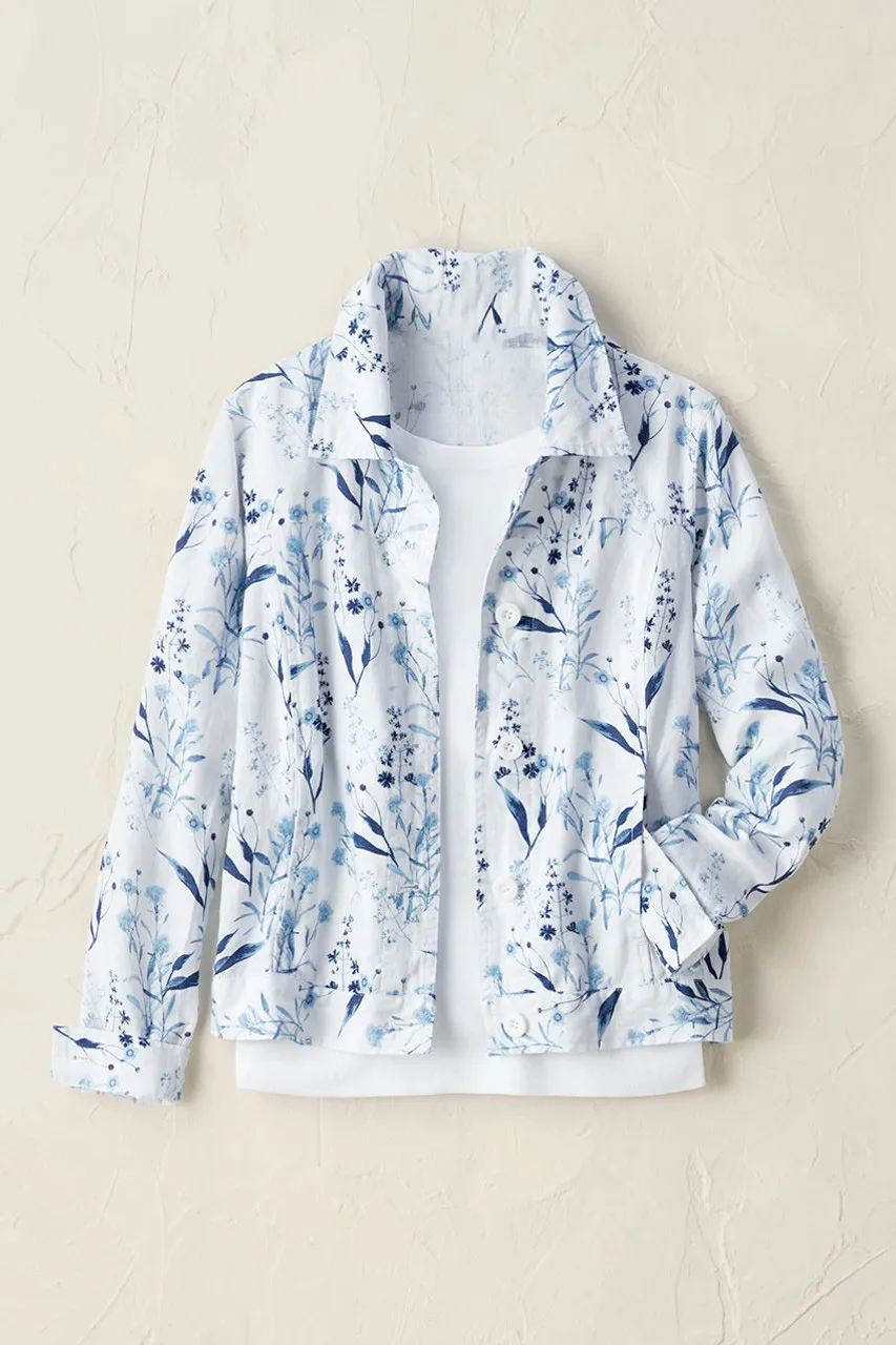 Blue botanicals give this linen jacket a lively air – an expressive daytime look or a casual layer with rolled sleeves and denim. Midweight for cross-season versatility. Button front, princess seams, on-seam pockets.
