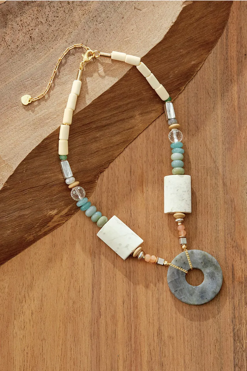 Chunky genuine agate stones tell a sculptural story, ending with a striking 1?" circle pendant. Slightly weighty at just under 3 oz.