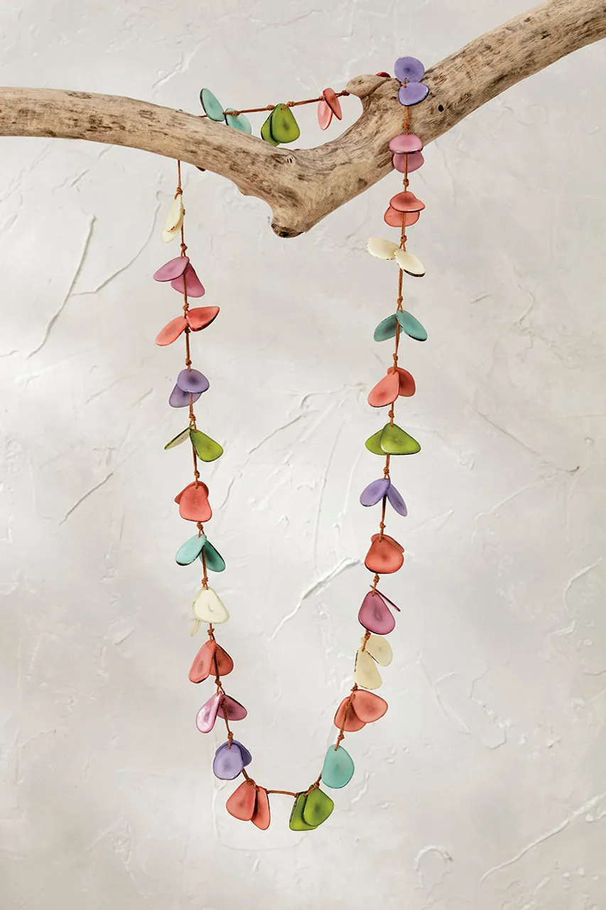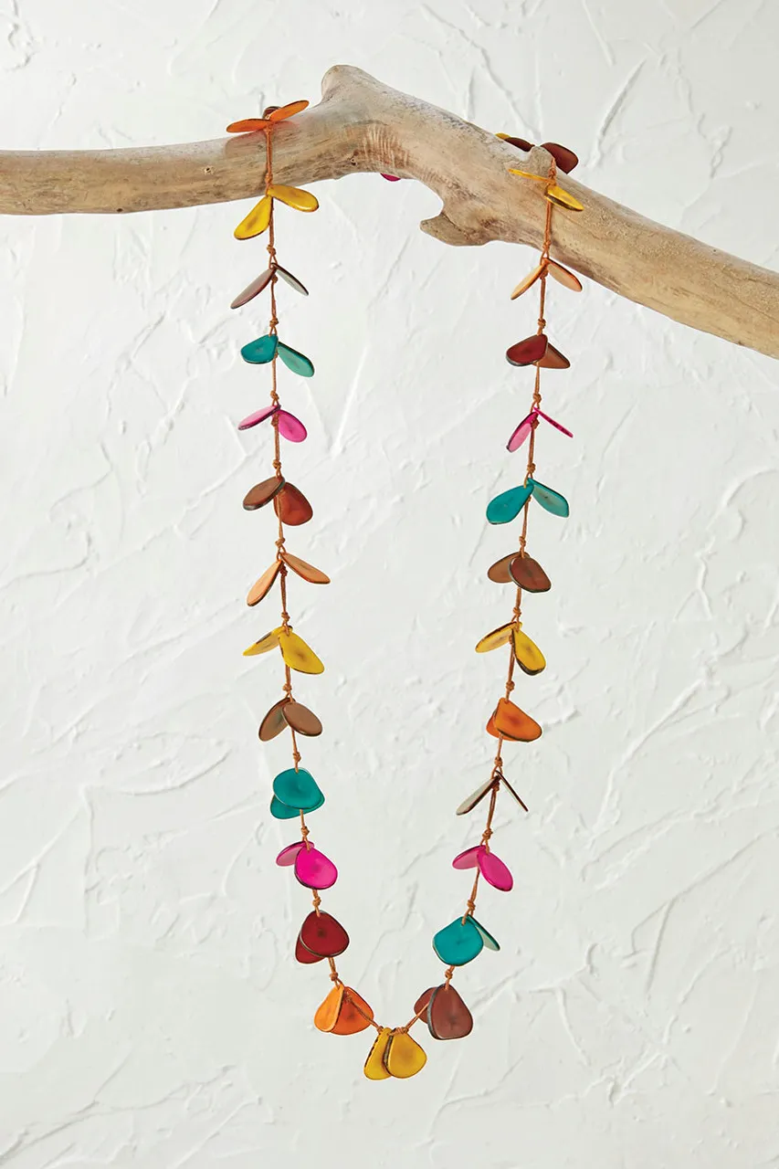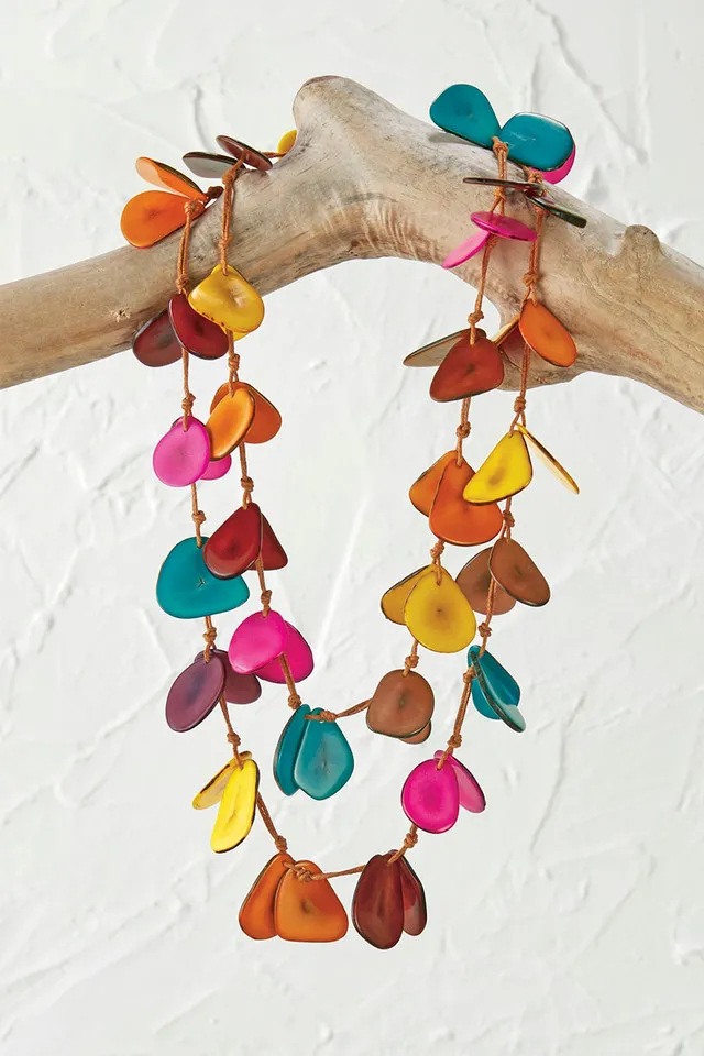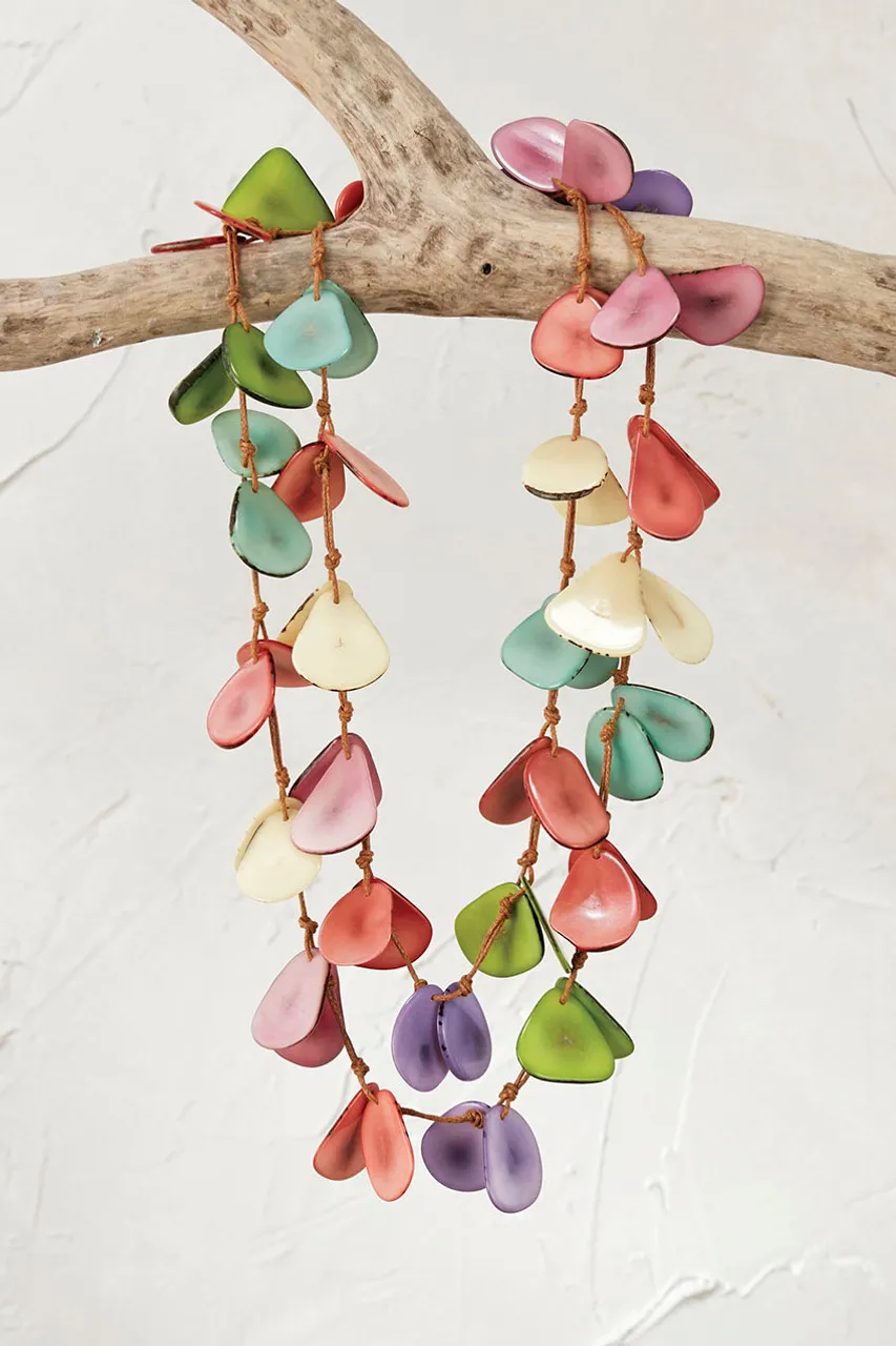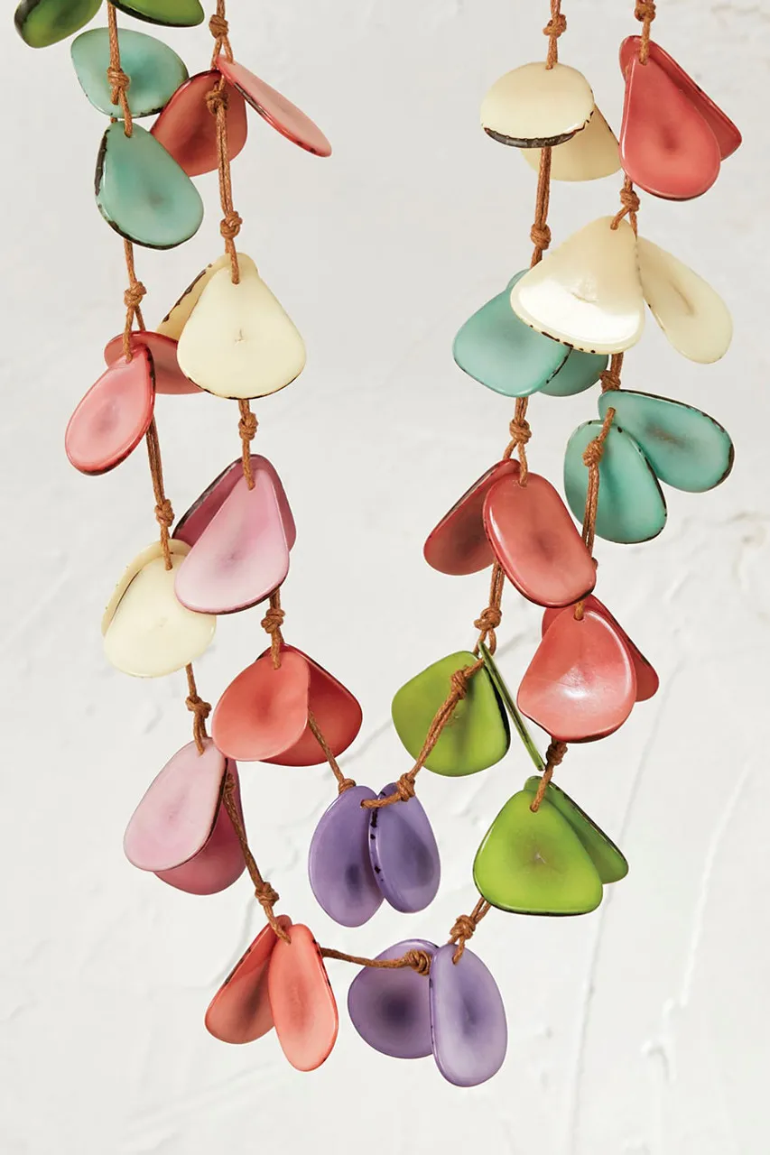 Light as butterfly wings, and just as colorful. Natural tagua nuts are shaped, vegetable-dyed and hand-strung in Ecuador.