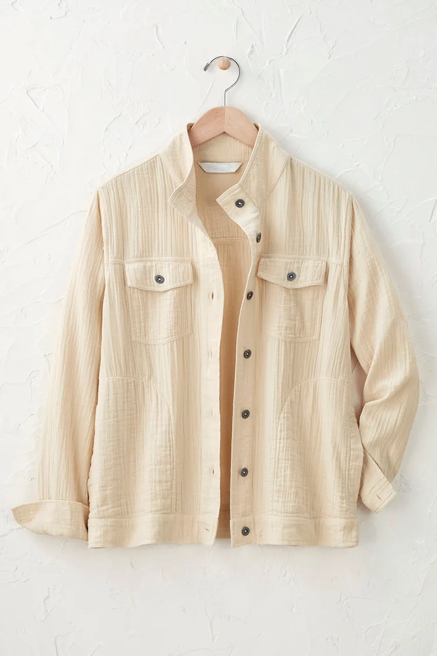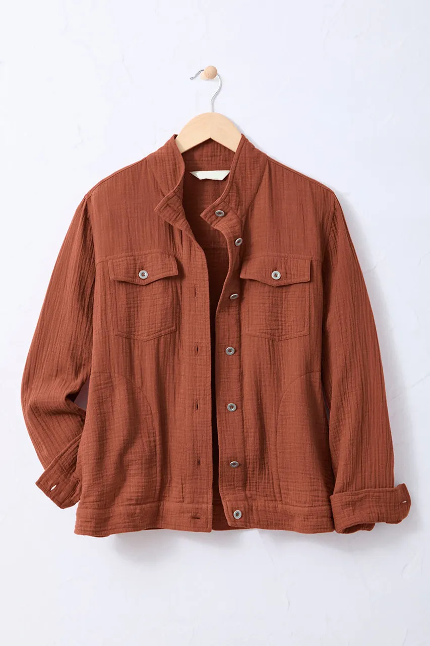 This casual topper combines denim jacket details with our go-to summer gauze – for a light and easy layer all season long. Button front with banded hem, back yoke, chest and on-seam pockets.
