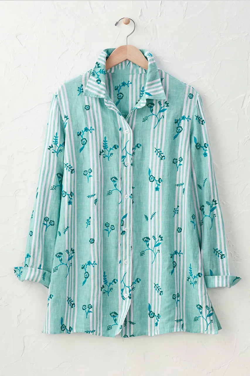 The lightweight big shirt you love, in European-grown linen – now in a medley of fresh, aqua-blue stripes and sprigs of floral embroidery. So easy to toss on as a top layer, or wear solo. Pleated back yoke, side-slit hem.