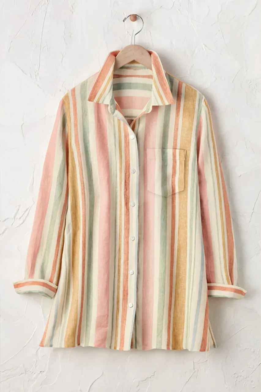 The lightweight big shirt you love, in colorfully striped, European-grown linen C updated with a roomier fit, long sleeves and a great longer length. So it`s even easier to toss on as a top layer. or wear solo. Pleated back yoke, single chest pocket, side-slit hem.