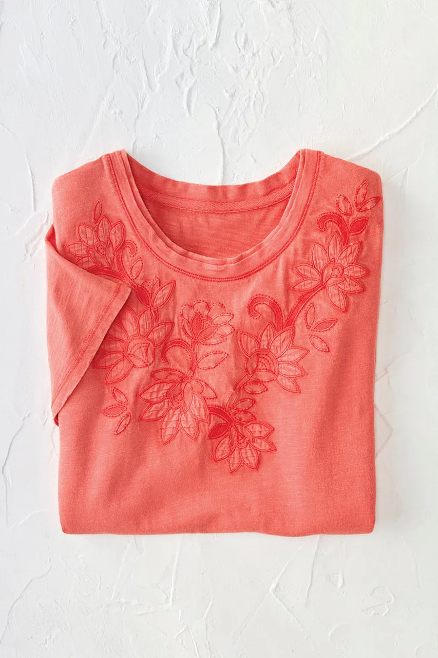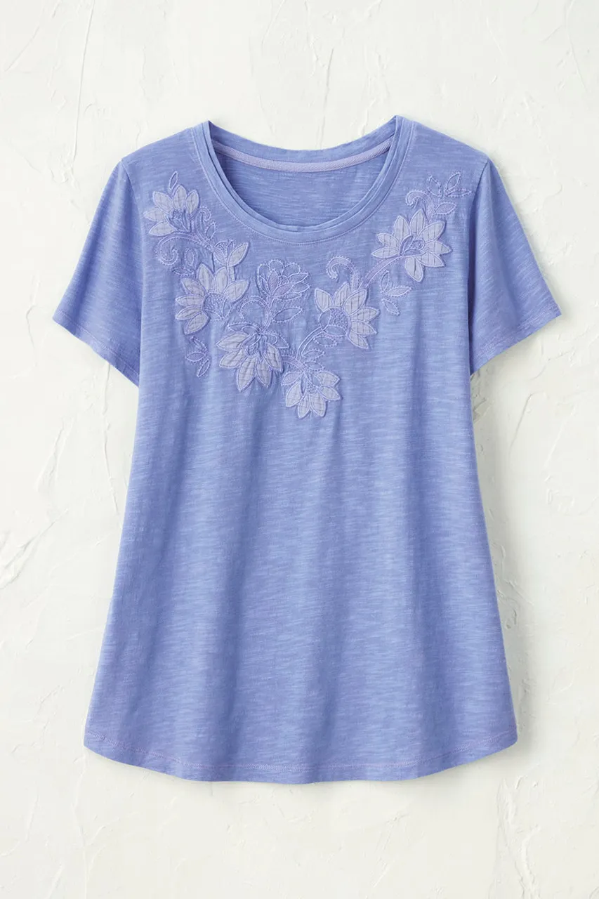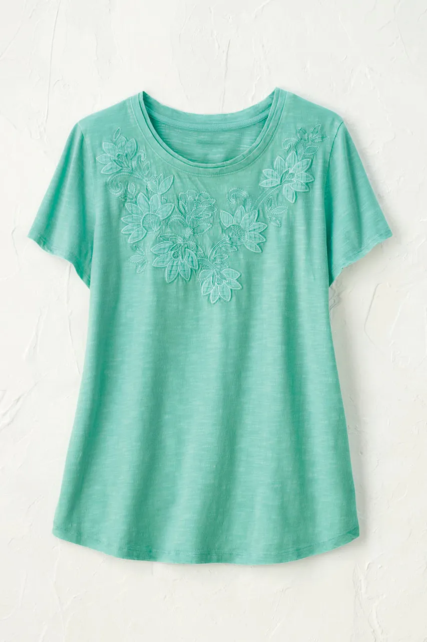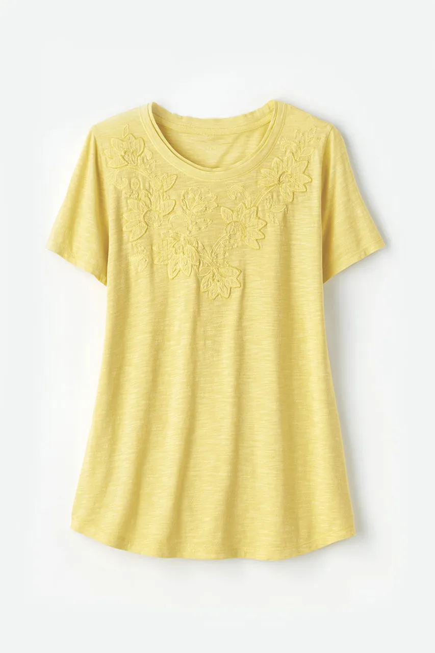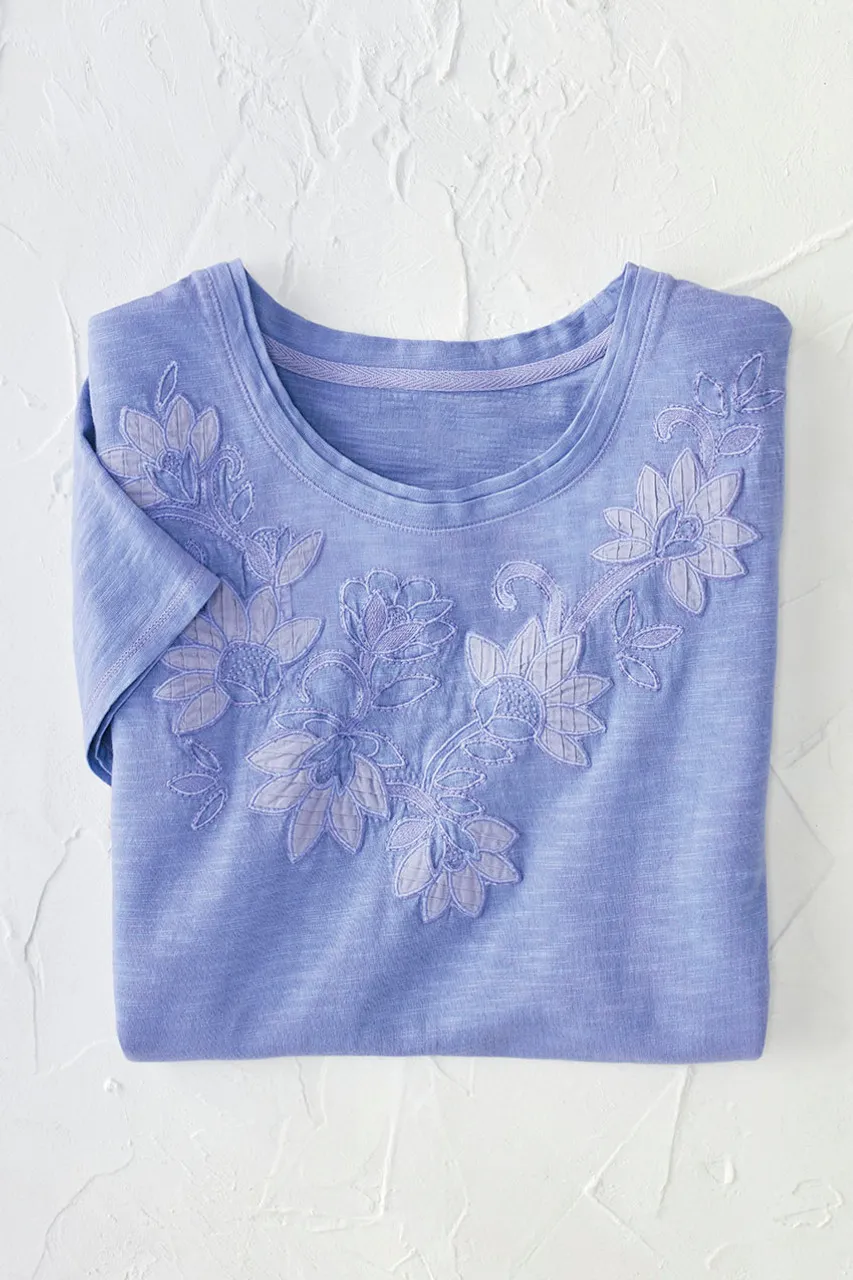 Softly textured slub-knit tee is romanced with floral ribbon appliqués and finished with a layered neckline. Solid back, curved hem. Imported.