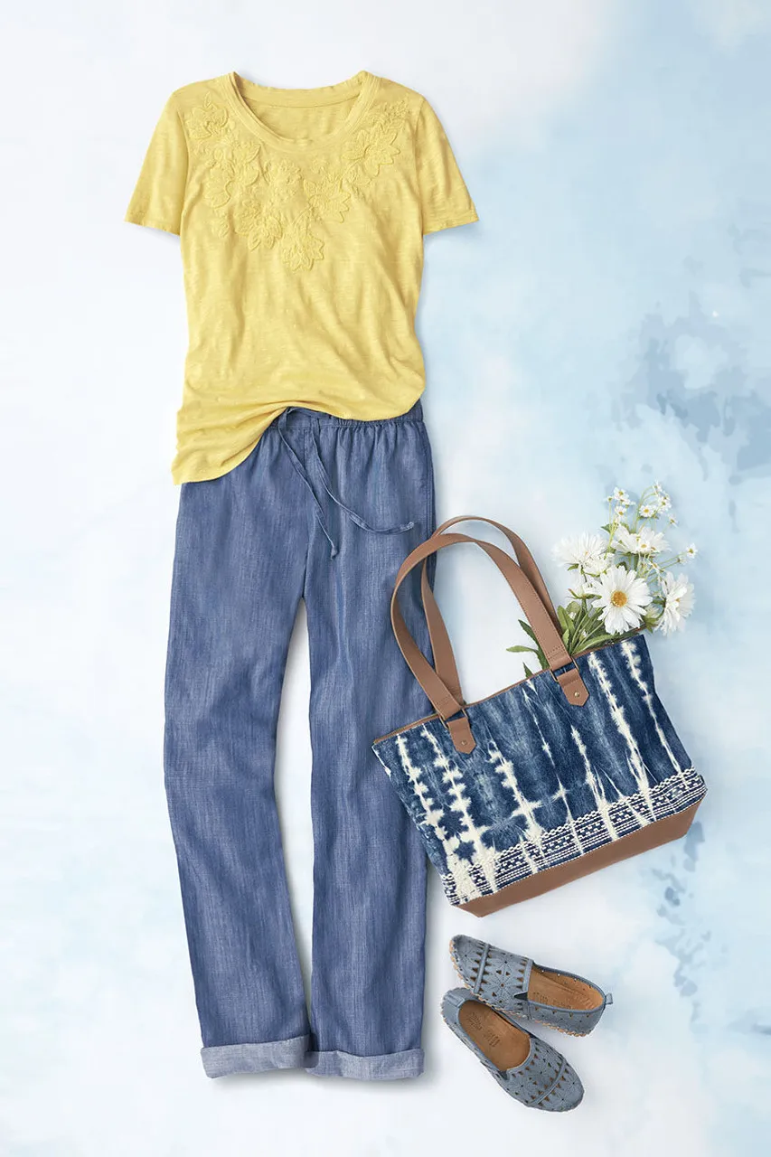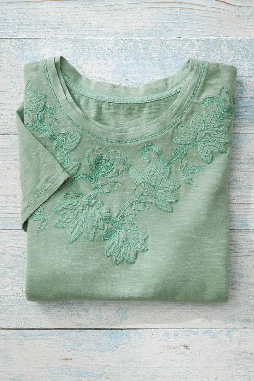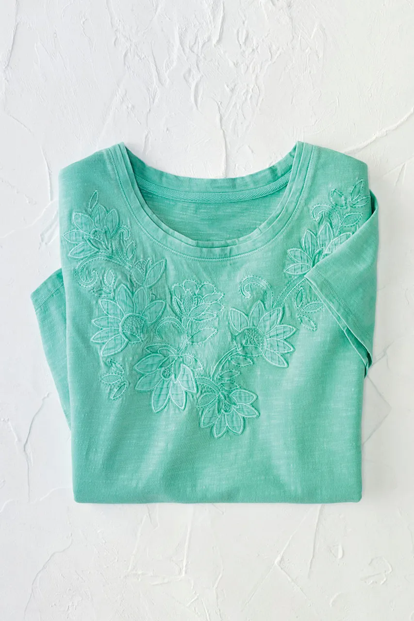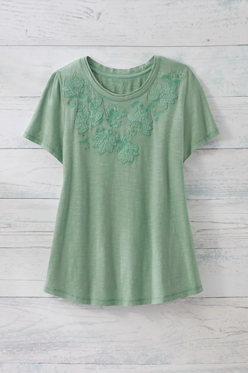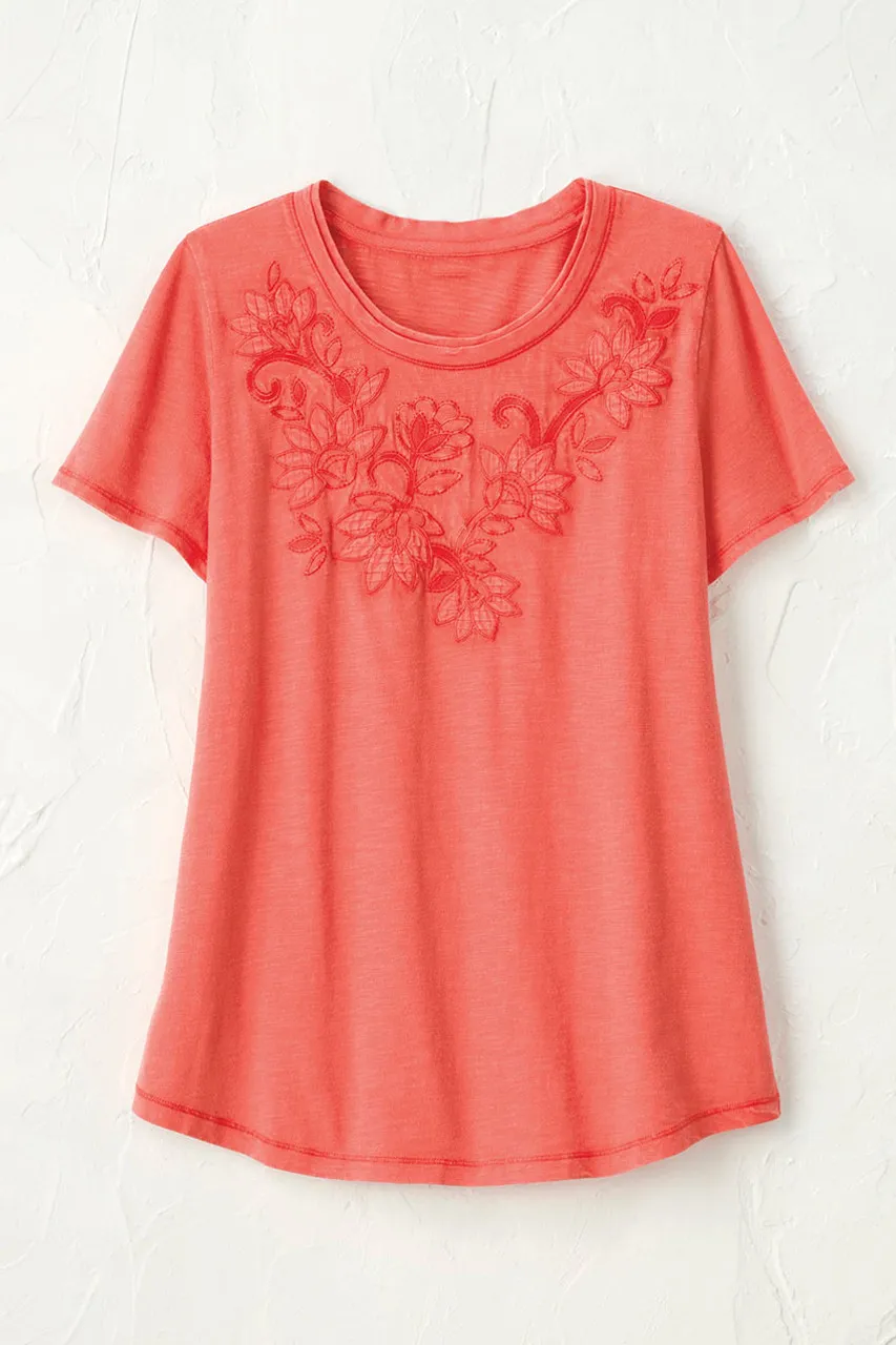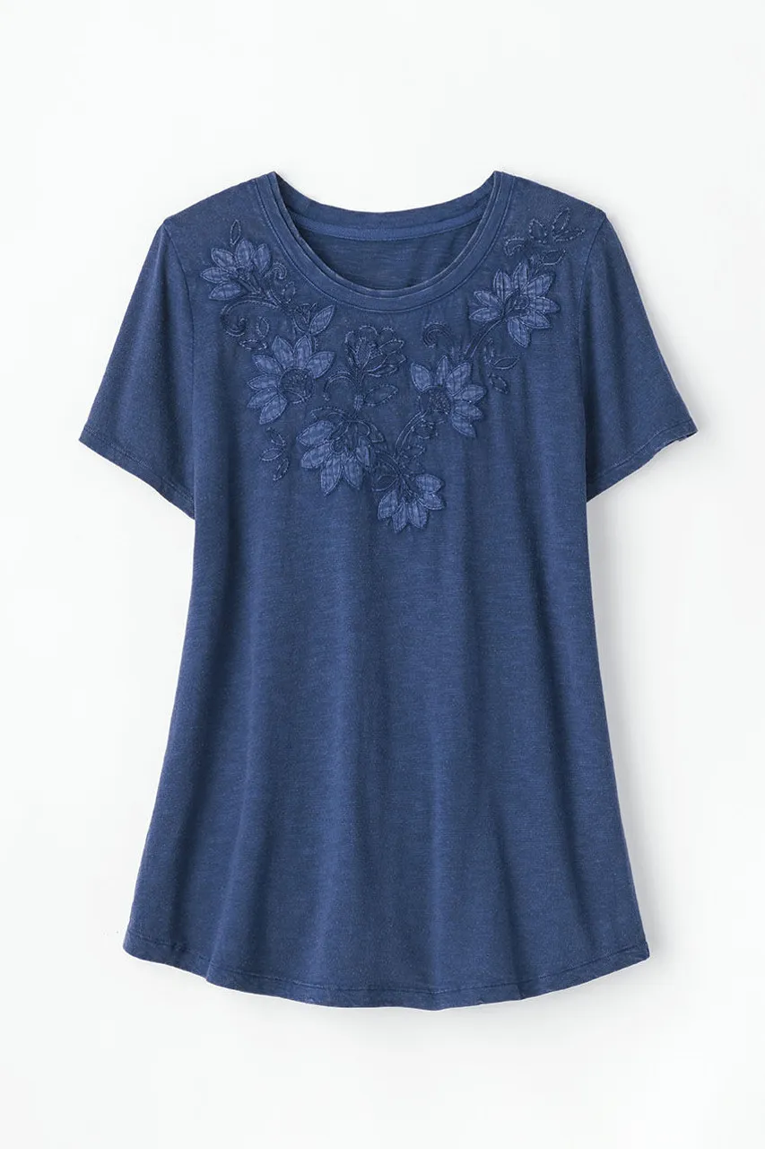 Softly textured slub-knit tee is romanced with floral ribbon appliqués and finished with a layered neckline. Solid back, curved hem. Imported.