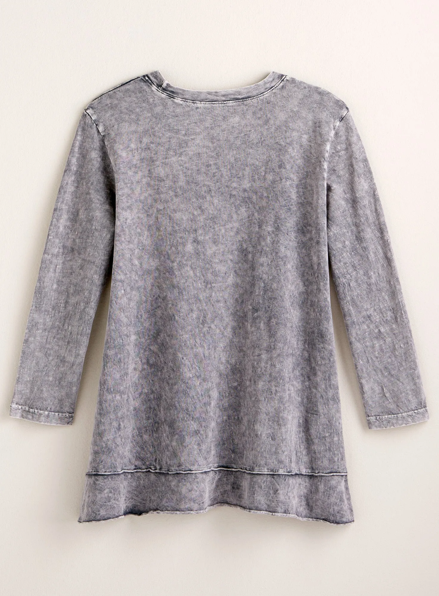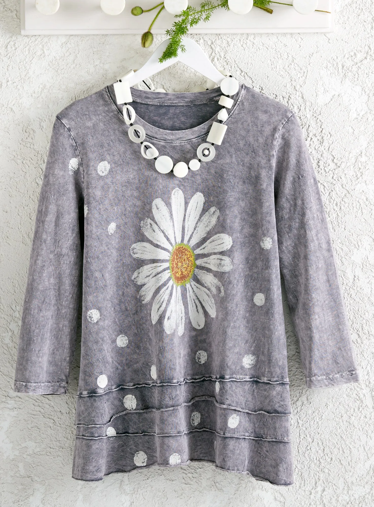Sweet and simple with flirty layered ruffles, this tiered top is a recipe for casual fashion fun. With a giant daisy in the center―a symbol of hope and loyal love―and polka dots all over, it couldn't be cuter. In super soft and comfy light gray mineral-washed cotton knit with 3/4-length sleeves.