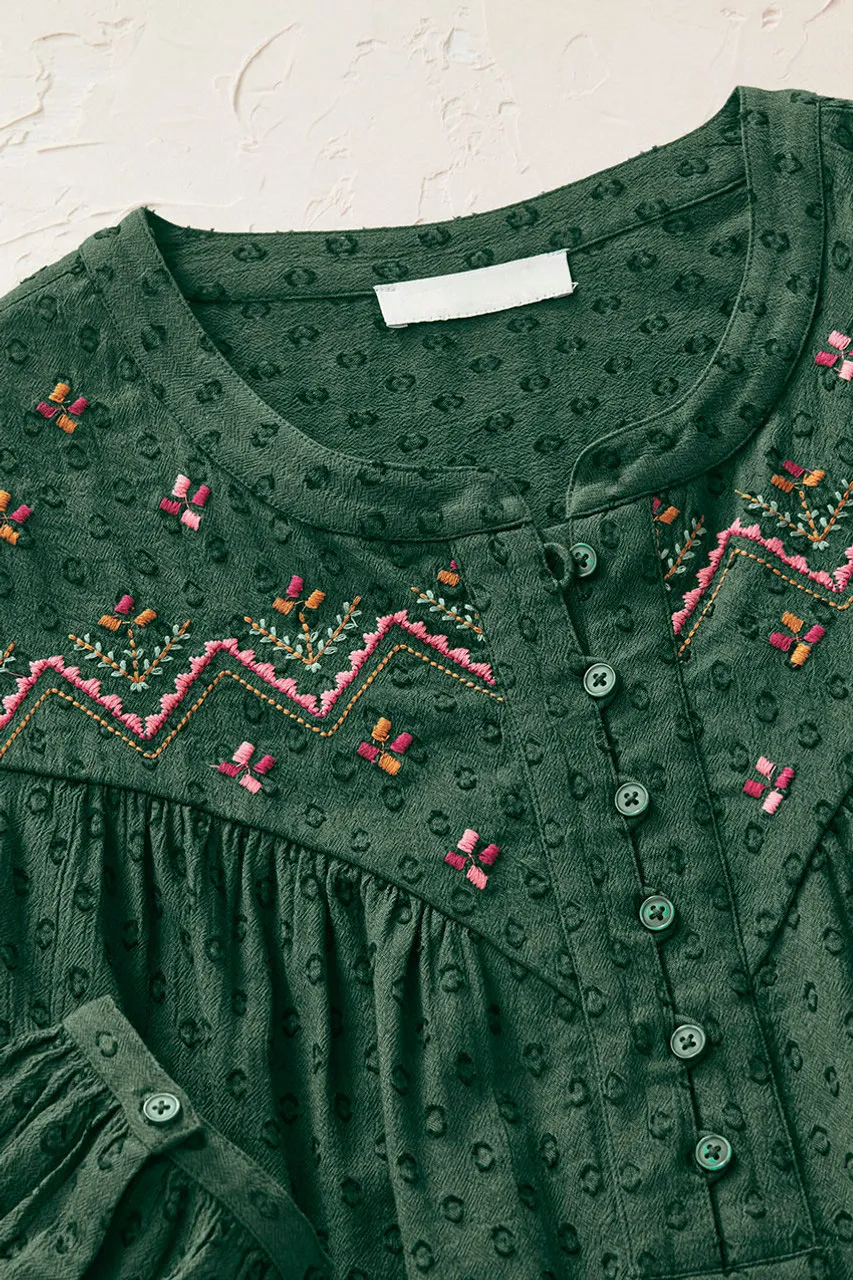 Artfully layered details add a touch of romance to this popover blouse, with clip-dot texturing and pop-of-color embroidery.