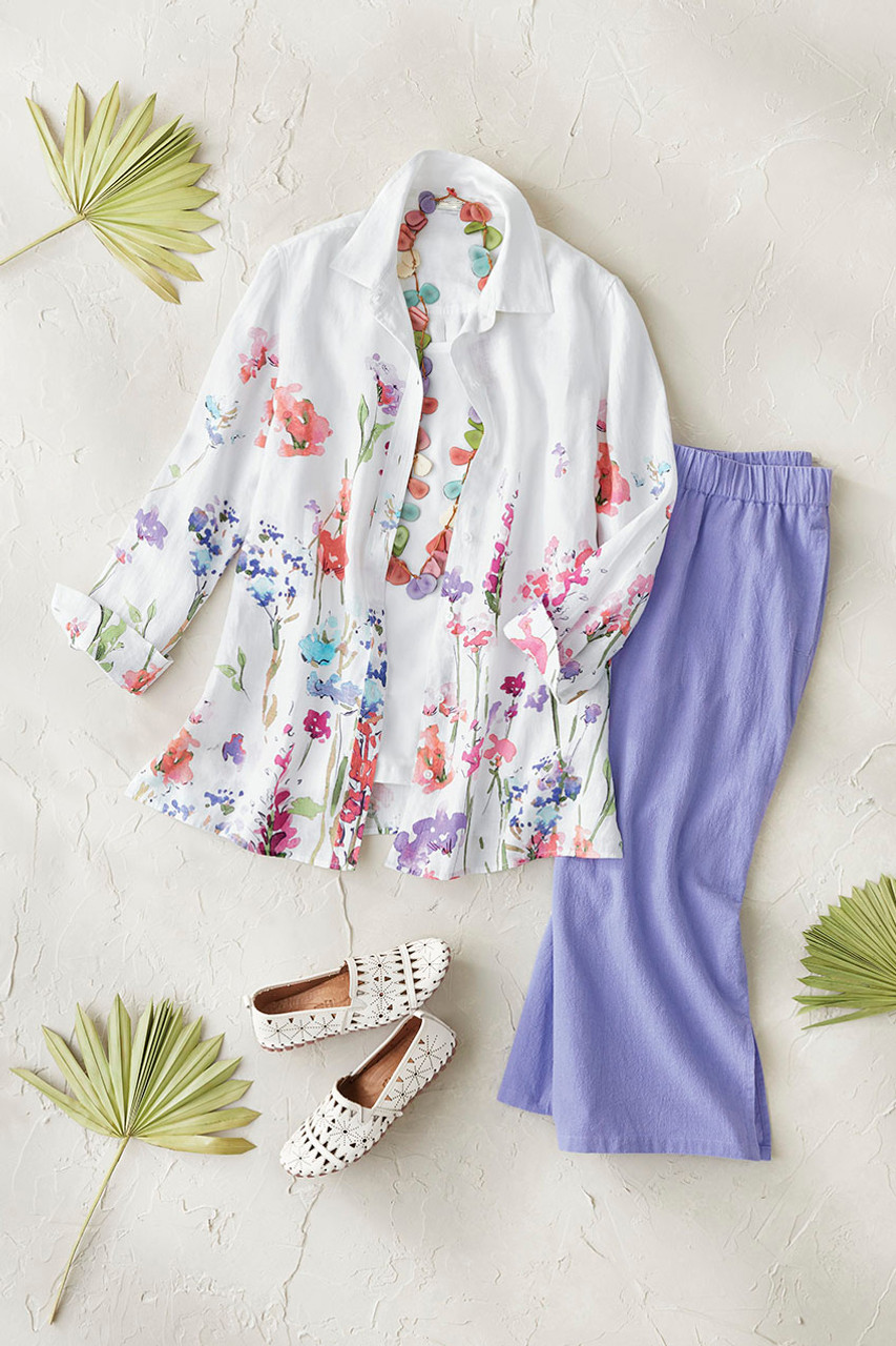 Plein-air inspiration on natural, European-grown linen – an expressive, painterly floral print adds artistry to our lightweight big shirt. So easy to toss on as a top layer, or wear solo. Pleated back yoke, side-slit hem.