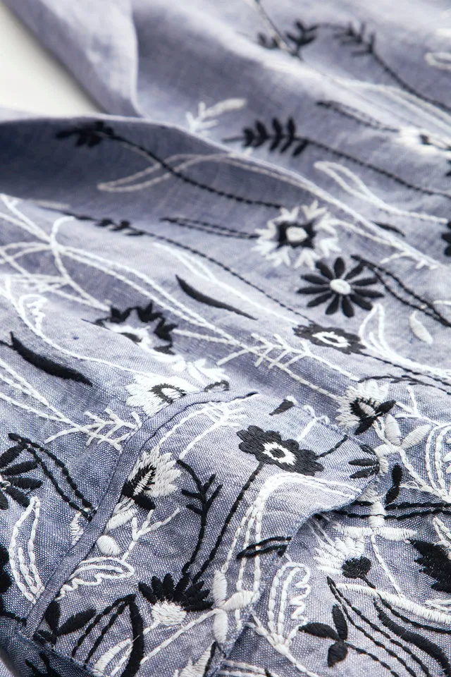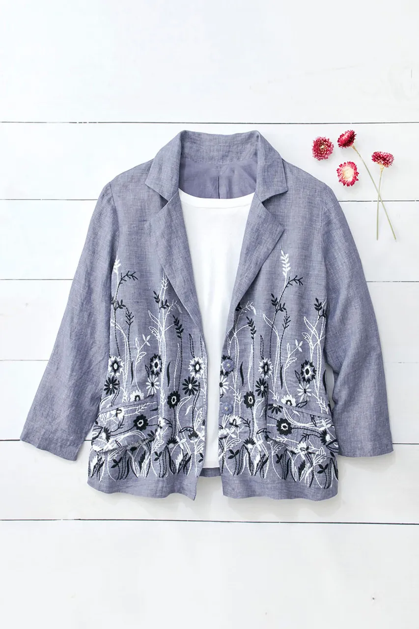 European-grown linen with a beautifully fresh twist. Floral embroidery grows up from the hem, creating a naturally artful topper. Button front, 3/4 sleeves, welt pockets with flap.
