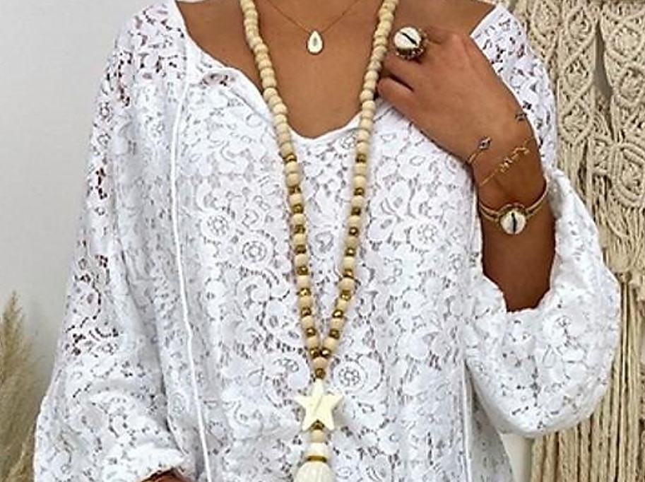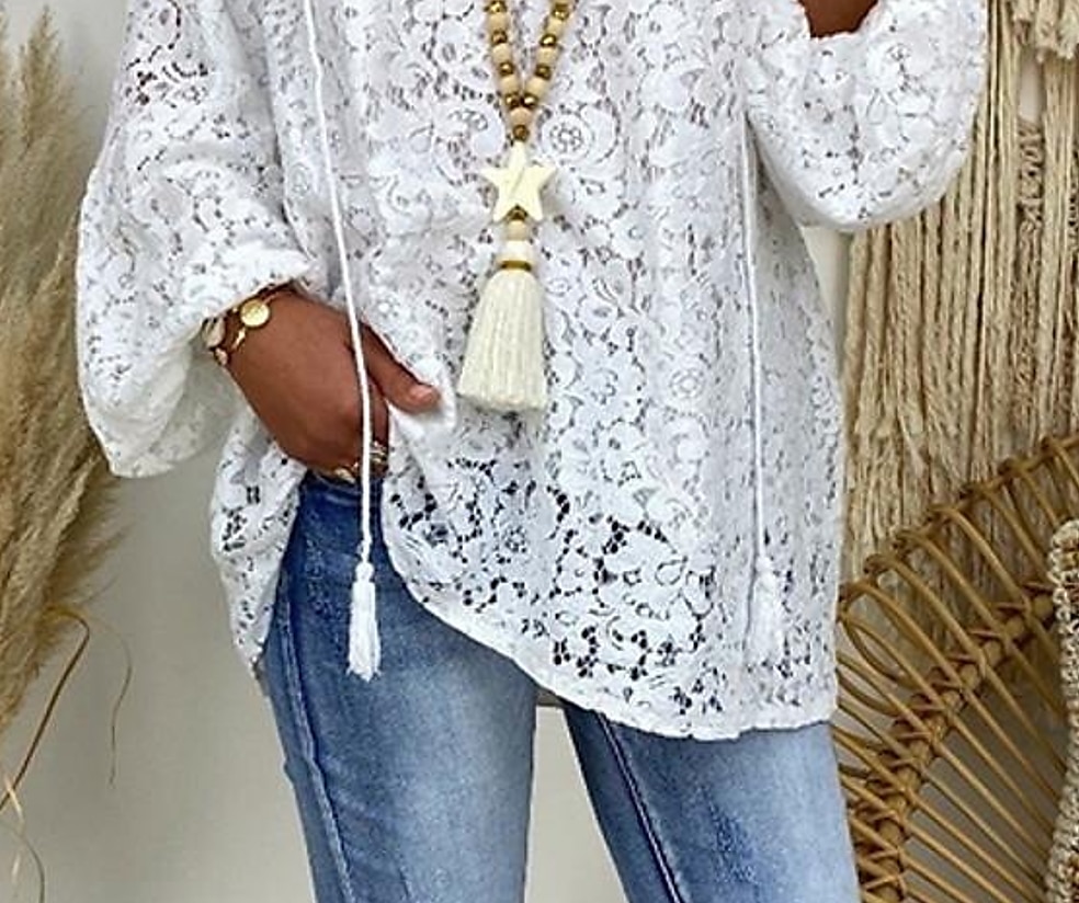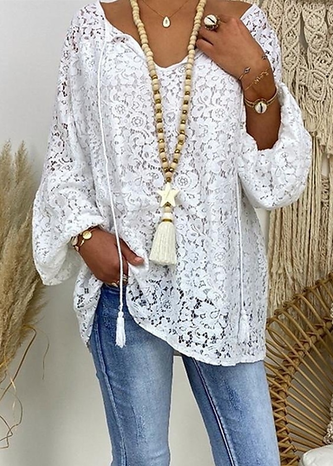 • Women's Blouse White Floral Lace Long Sleeve Daily Vacation Streetwear Elegant Casual V Neck Plus Size L