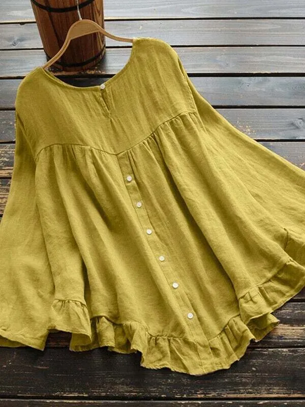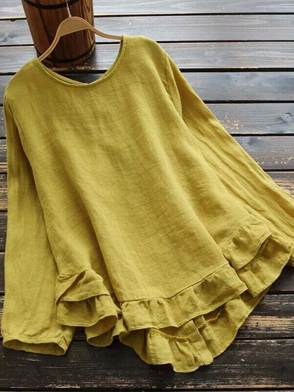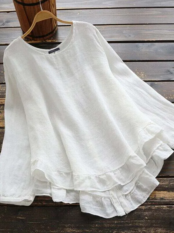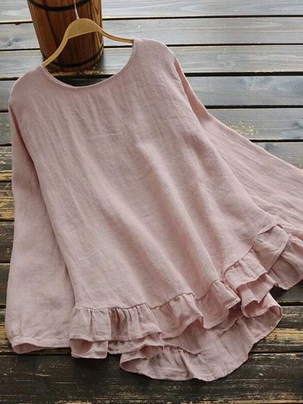 Women's Cotton Linen Solid Color Round Neck Long Sleeve Irregular Hem Shirt