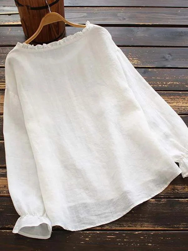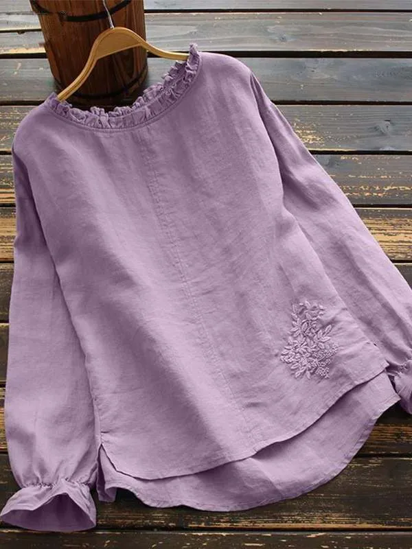 Women's Cotton Linen Solid Color Round Neck Long Sleeve Shirt